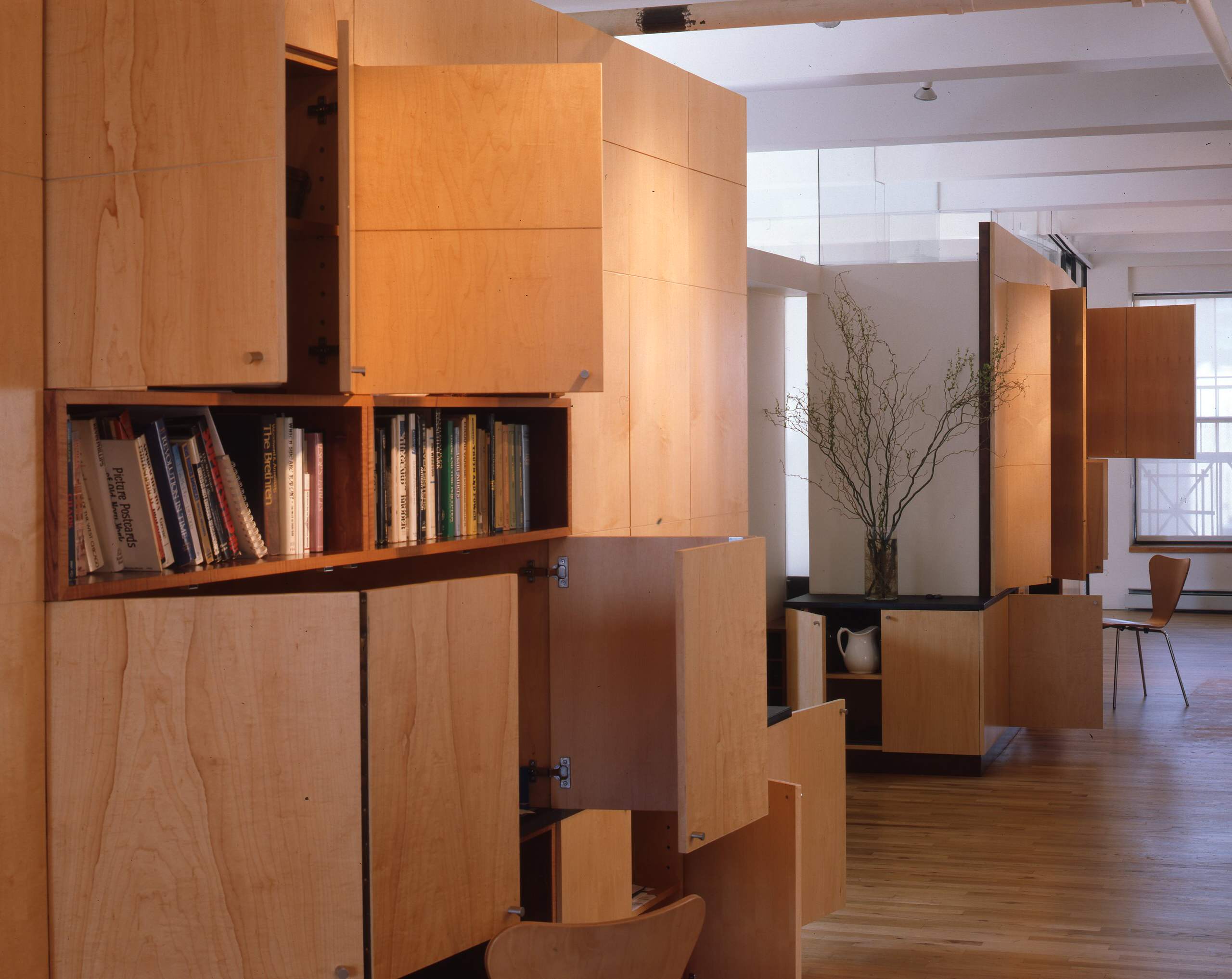 This wall of cabinetry acts as the central organizing element in this renovated loft. It organizes the public and private areas of the plan, and it also has a massive amount of function in its subtly curving form.