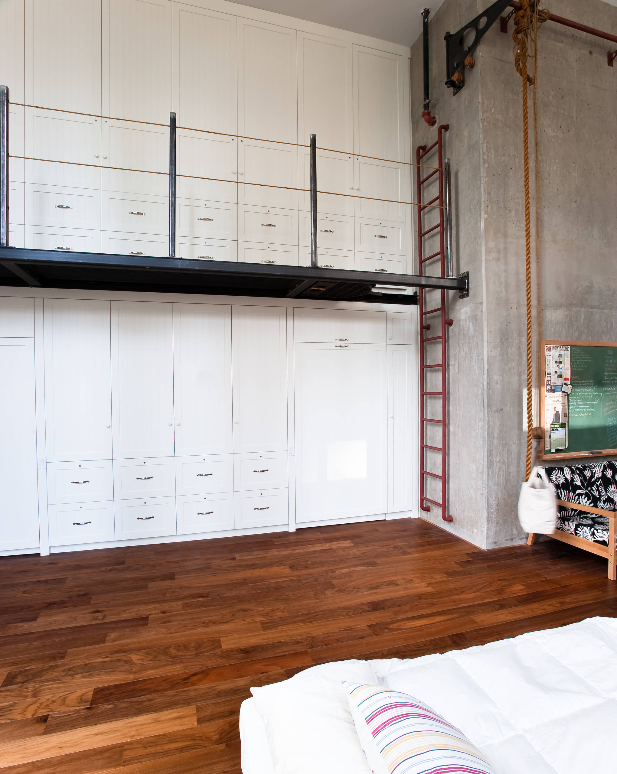 Seen here fully revealed, the wall gives way to two Murphy beds and an entertainment unit. Despite the regularity on the front face, each functional priority has been designed carefully — integrated headboards, drawers, flip-back doors (that don’t conflict with raising the beds) and closets.