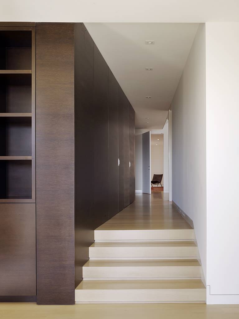 One can see from this vantage point just how cleverly the architect has concealed an enviable amount of storage beneath this stair. The stair stringers, the sloping wood framing supporting the stair, are set back from the face of the cabinet doors. This allows the cabinet doors to follow the rectangular sawtoothed profile of the treads and risers and not the angular underside of the stringer. When the doors are closed, they form an understated patchwork on the face of the wall and complement the architecture of the room.