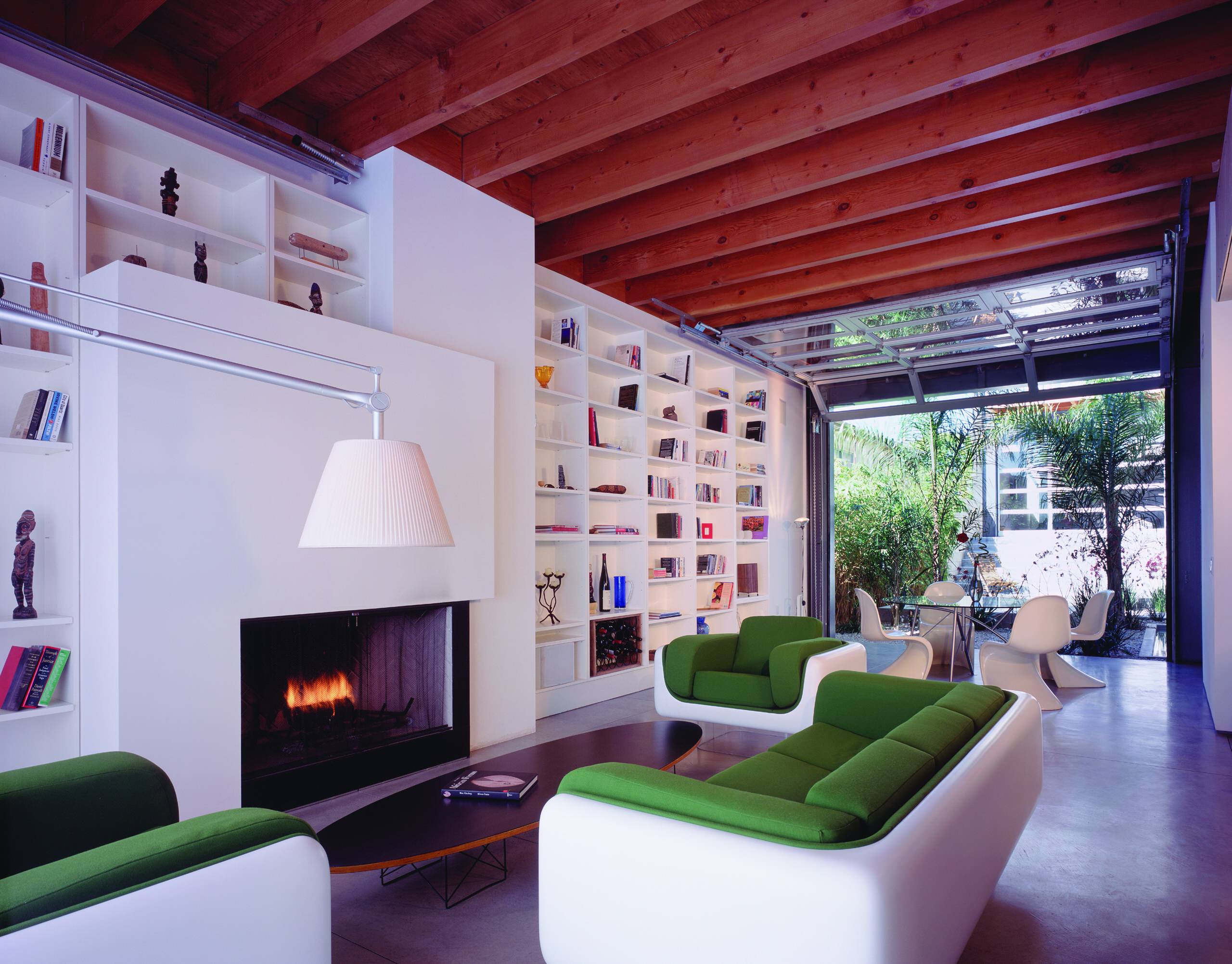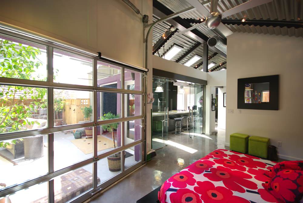 Here too the entire wall (one on each end of the room) dissolves to connect the living space to the outdoors. I find that the most appealing uses of sectional doors in the home are the ones that stretch the openings to the full width of the adjoining space. They appear the most transformative between open and closed and the most logically integrated into the architecture.