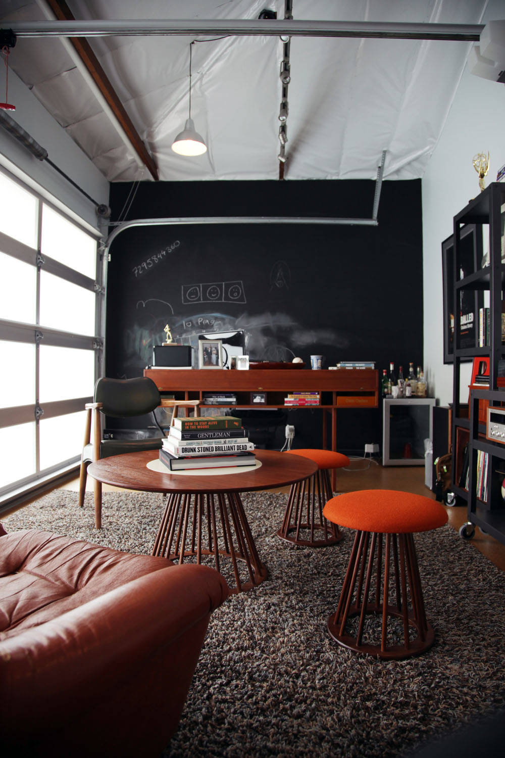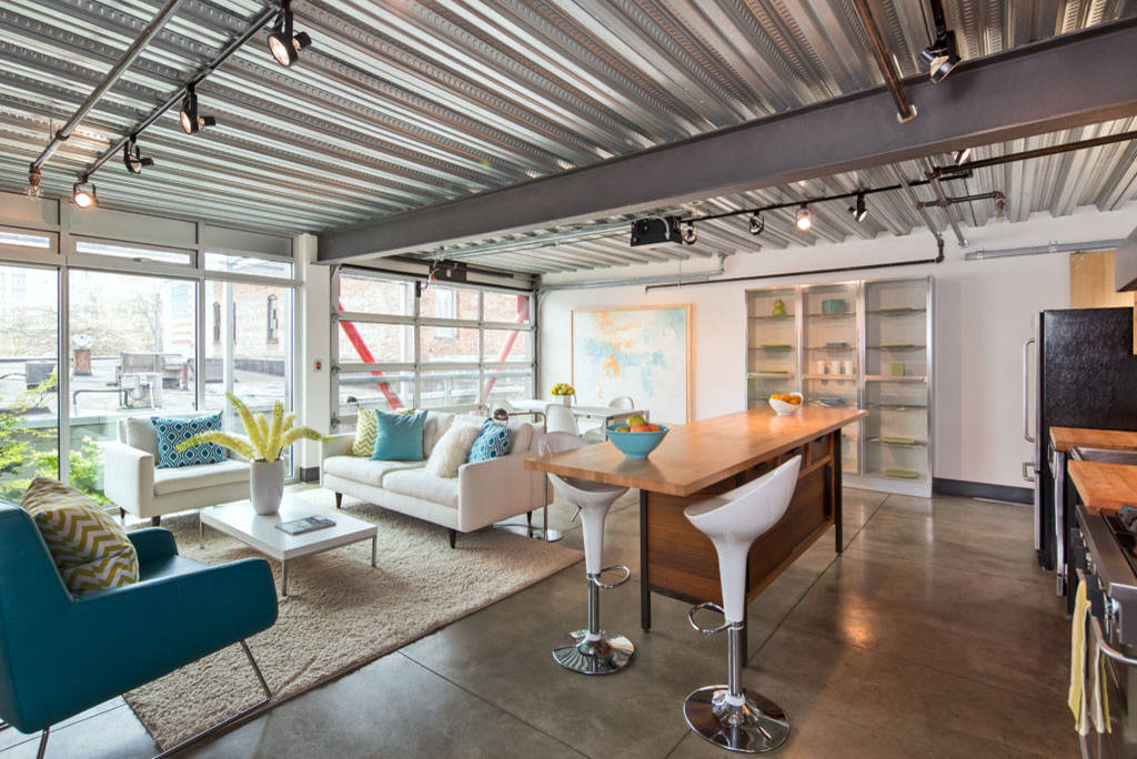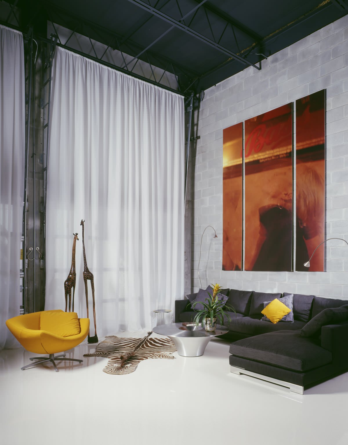 Most of the examples thus far have embraced the overhead door for its raw beauty and sought to celebrate it. But there are times when a buffer between the door and living space can be useful too. The scrim drapery used here provides a counterpoint to the robust industrial aesthetic, softening it while simultaneously helping to minimize potentially uncomfortable convection currents around the cooler door space.