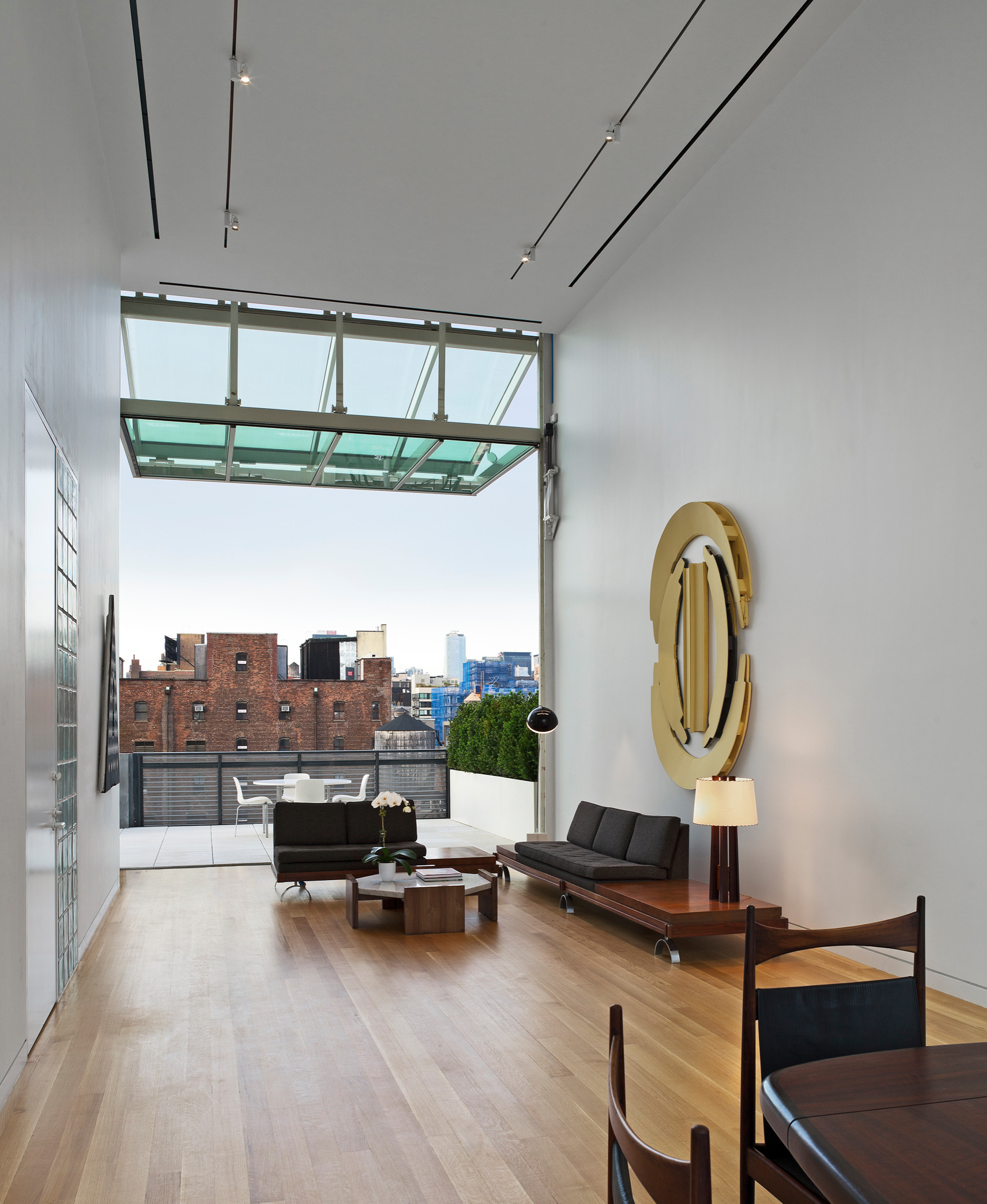 This upward-pivoting 20-foot-tall sectional door opens this entire penthouse apartment to the city and offers proof that, when carefully designed, the overhead door can work in almost any climate, even one as extreme as New York’s. The pivoting panels create a folded, glazed roof for the outdoor area.