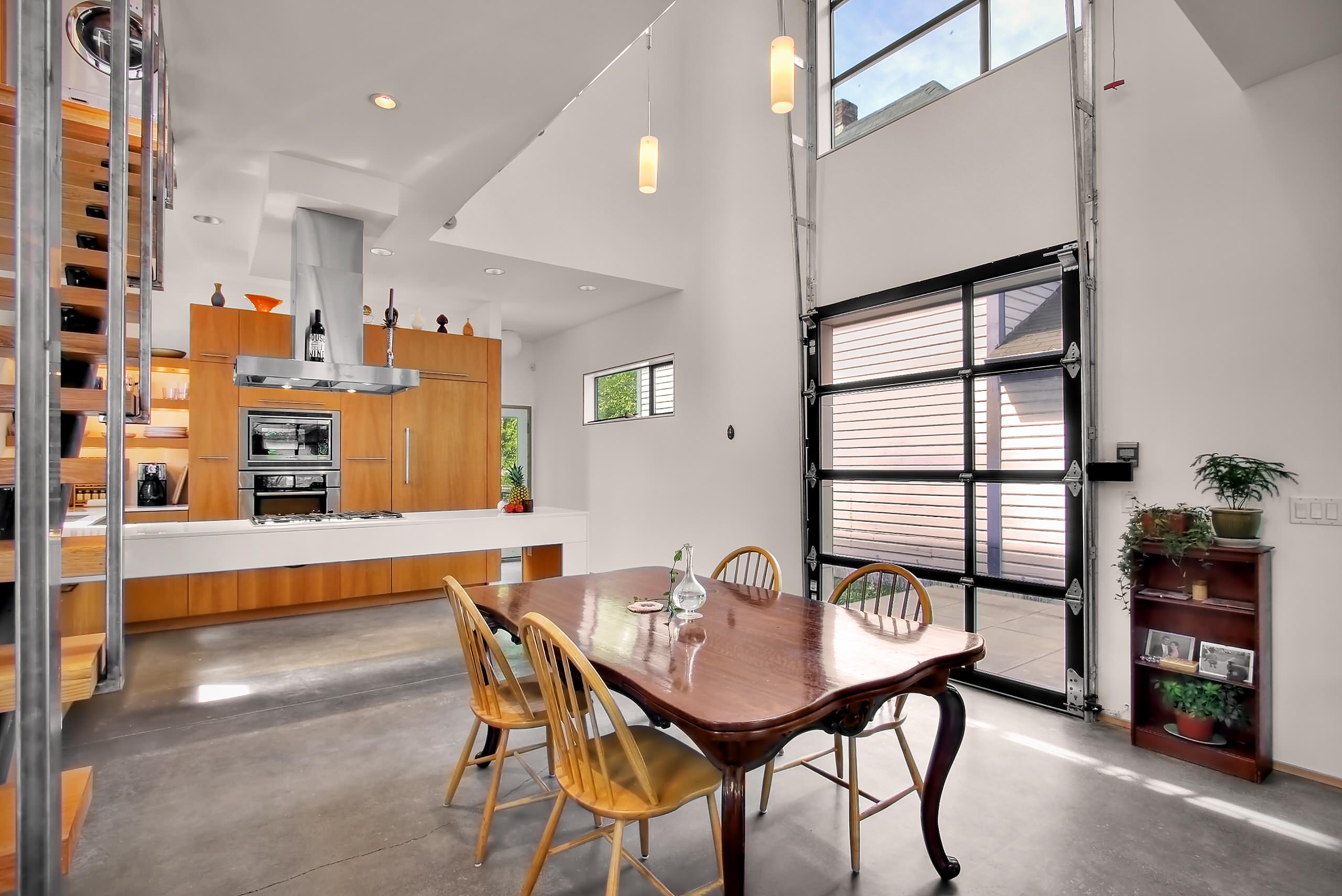 Not only are sectional doors great for connecting indoor and outdoor spaces, but you might consider using them between interior and semiexterior spaces, as seen here. When the door is open, the kitchen blends with the nearby screened porch. With fewer weather-driven restrictions, this application delivers all of the visual and spatial benefits and still allows a way to seasonally separate these essential transition spaces.