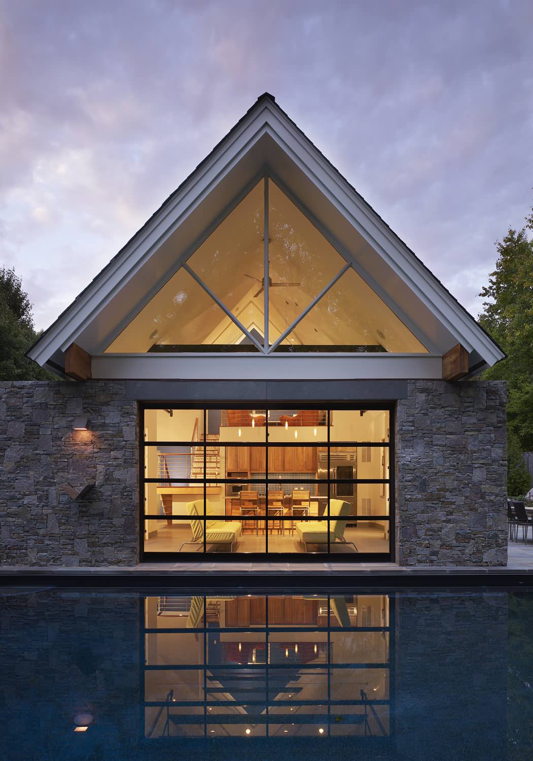 The darker mullions on this sectional door elevate and refine it and certainly befit the setting: stone, fine furnishings and a pool. In fact, it’s hard to tell that this is actually a garage door from this vantage point. It offers the chance to connect the pool house to the pool in a simple and direct way. Notice how the dark frame matches the structural frame and hardware inside, each an intentional design decision.