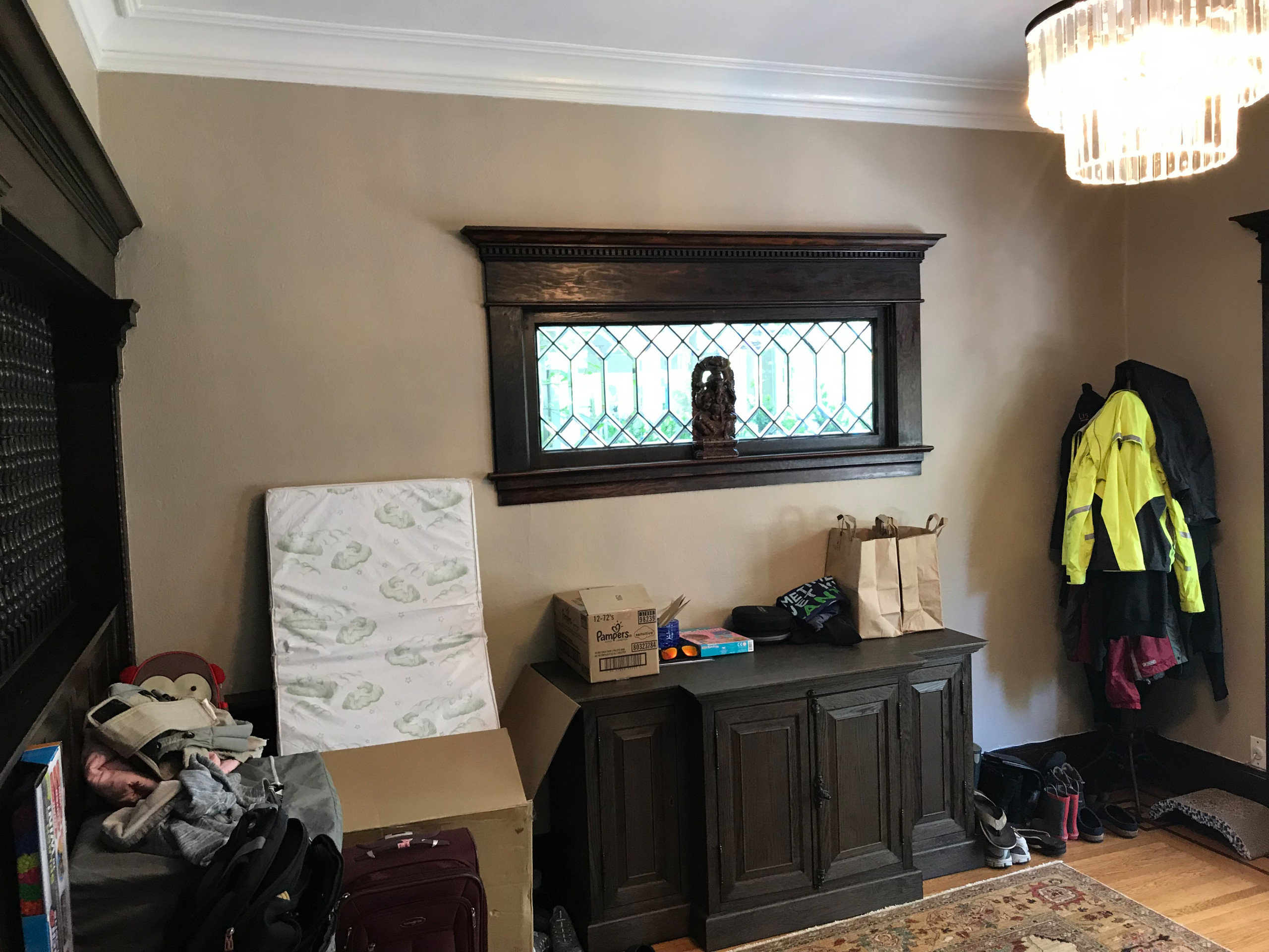 After: The home’s beautiful leaded glass windows are one of the owners’ favorite things about their home, and the new design needed to preserve the one seen here as a feature. When planning the layout, Kowalski centered a pair of tall coat cabinets around the window. She also kept enough room between the tops of the cabinets and the ceiling to show off the original crown molding. Potter Construction served as the contractor and built everything for the project.