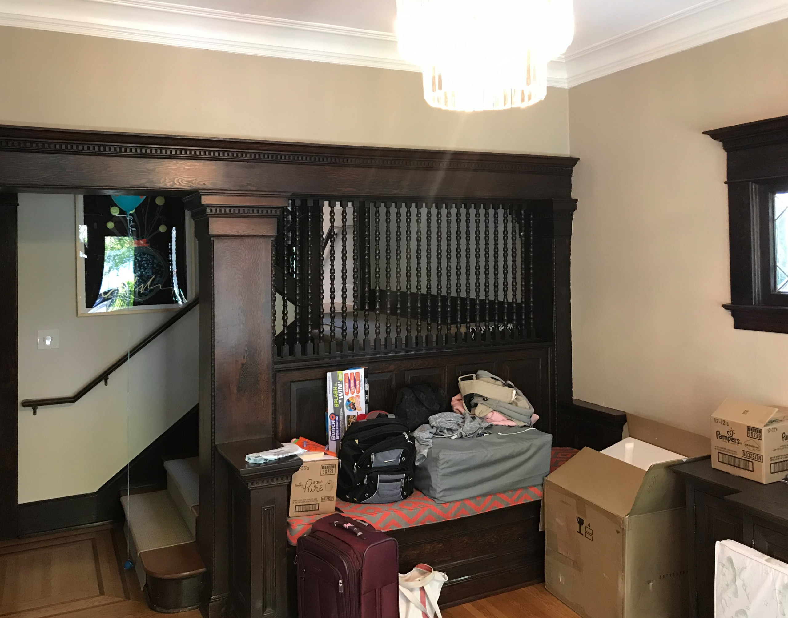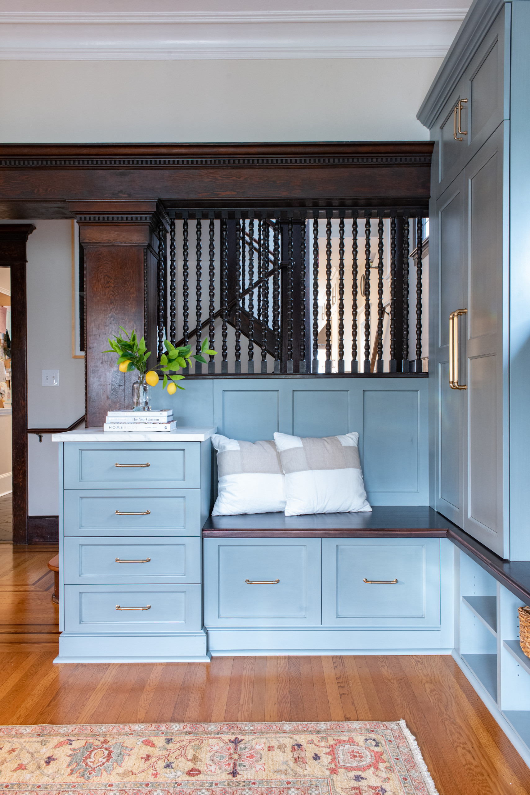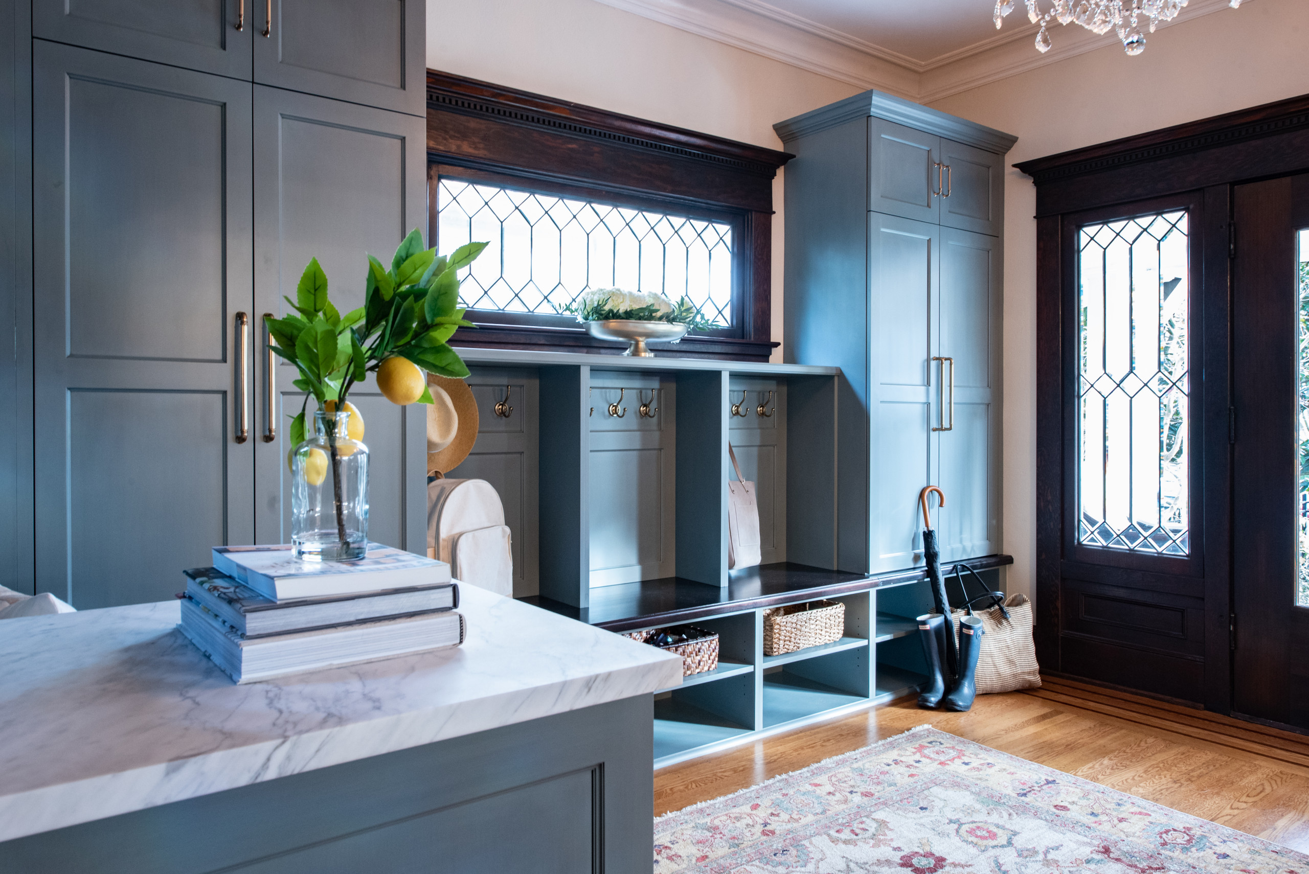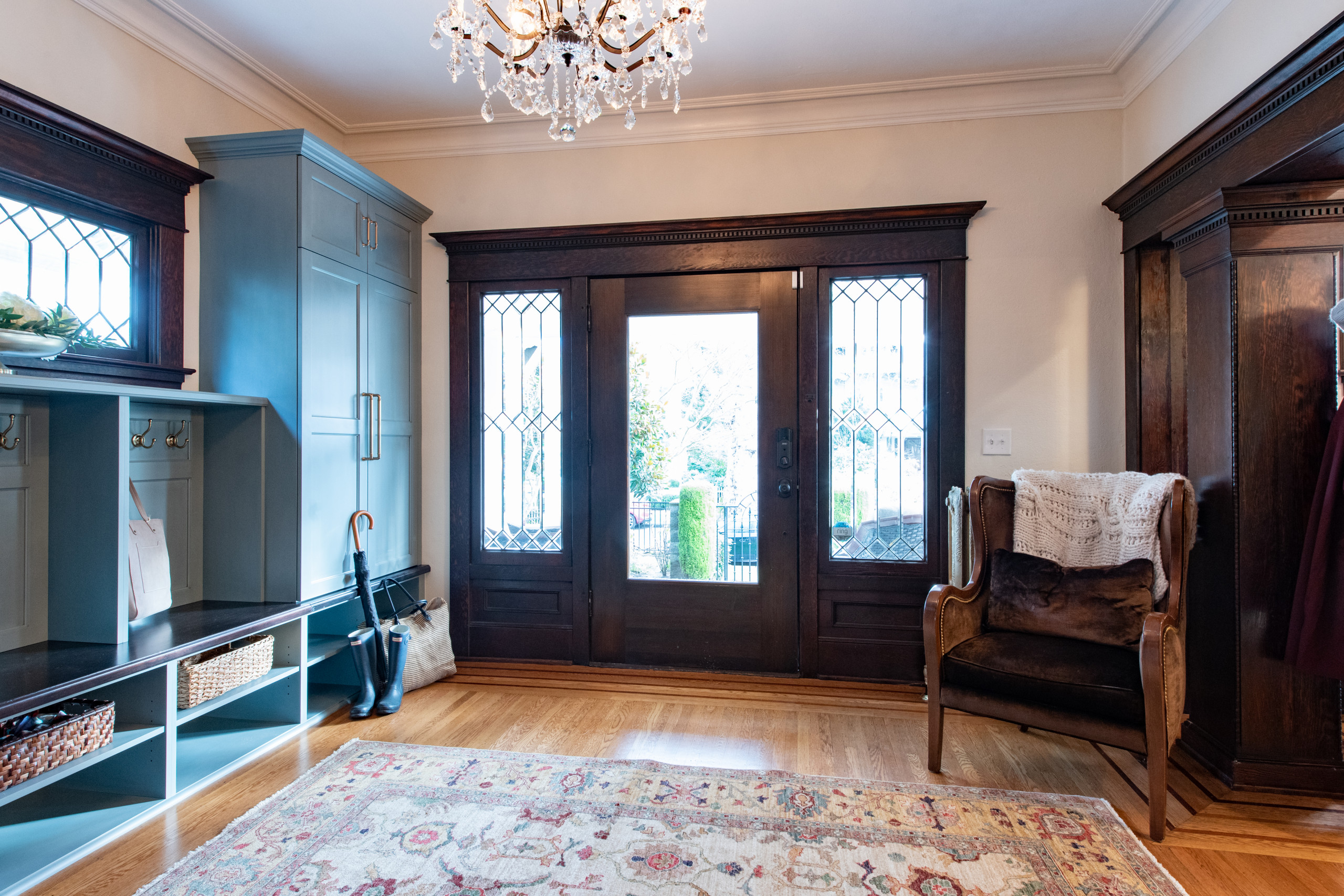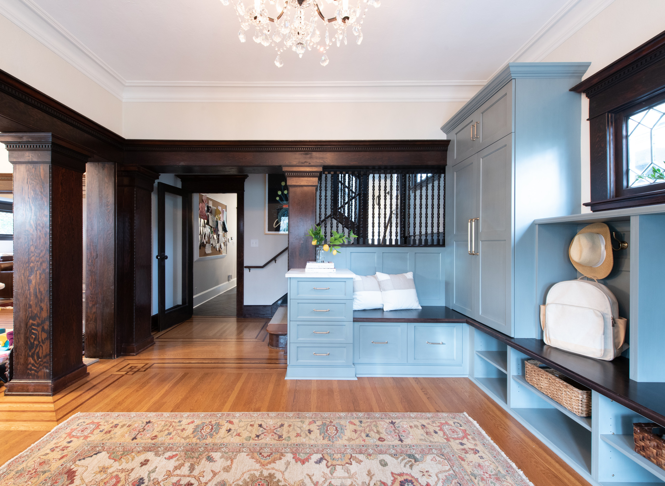 This beautiful 1906 Craftsman home had many well-preserved original details, including elaborate molding and leaded glass windows. But though the foyer was gracious, it didn’t function well for the young family that lived there. Interior designer Jennifer Kowalski came up with a design that complemented the beautiful period architecture and gave the family ample storage space for coats, shoes, hats, mittens, keys, mail and even tiny socks.