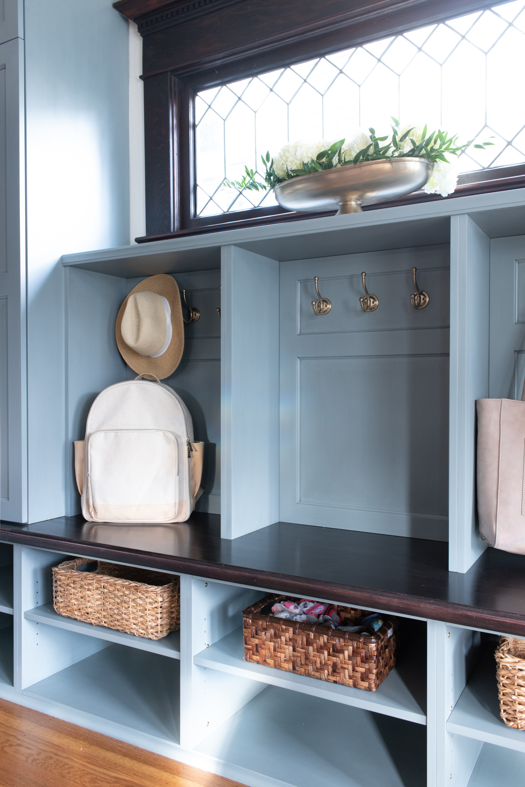 The homeowners find hooks more functional than hangers for coats, so Kowalski had them installed inside the closed cabinetry. The cubbies in the center have hooks for backpacks and accessories such as scarves. This area also serves as a bench for putting on shoes. Beneath it, the shelves are adjustable, so during the winter the homeowners can remove shelves to make room for boots. Baskets help corral items. One of the most important aspects of the new design is that it accommodates little socks.