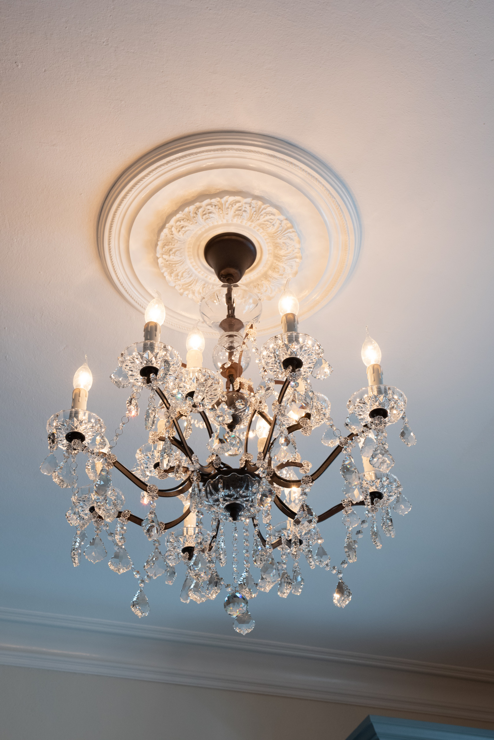The homeowners wanted a vintage-looking crystal chandelier, another element that greets visitors. And the icing-on-the-cake detail here is a new ceiling medallion. Kowalski researched the architectural period to find the right design. “Whatever we did needed to fit in with the home,” she says. “That was important to us and to the homeowners. As a designer that’s a dream.”