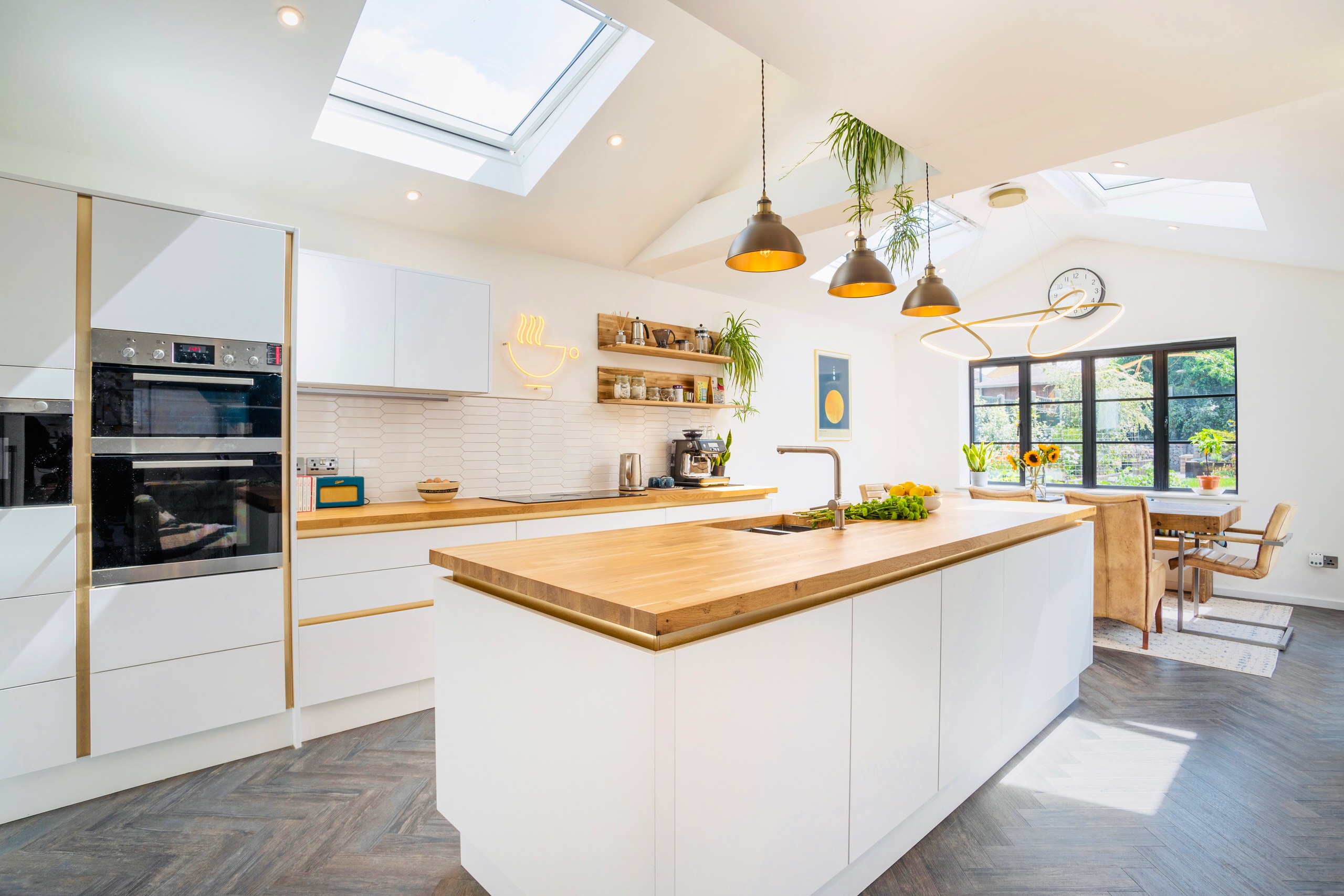 The couple wanted wood countertops, so designer Alicja Wawrzyniak suggested white cabinets to complement them. But it’s the addition of the brass rims within the cabinets that really sets this design apart.