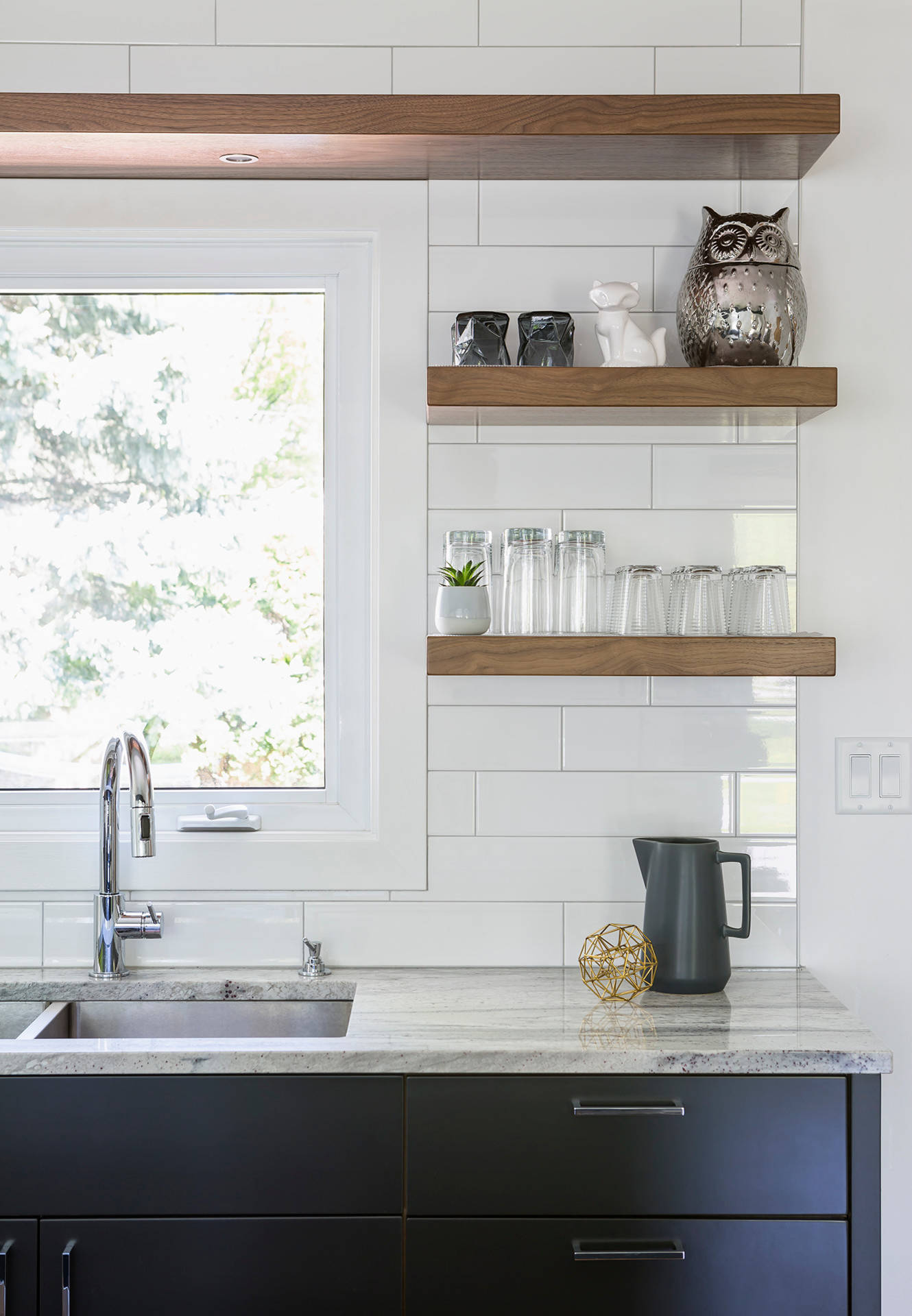 Roos added stained wood floating shelves with recessed lighting on the bottom to this stylish Minneapolis kitchen. “I believe that many clients are looking for less-complicated and less fussy-design,” she says.