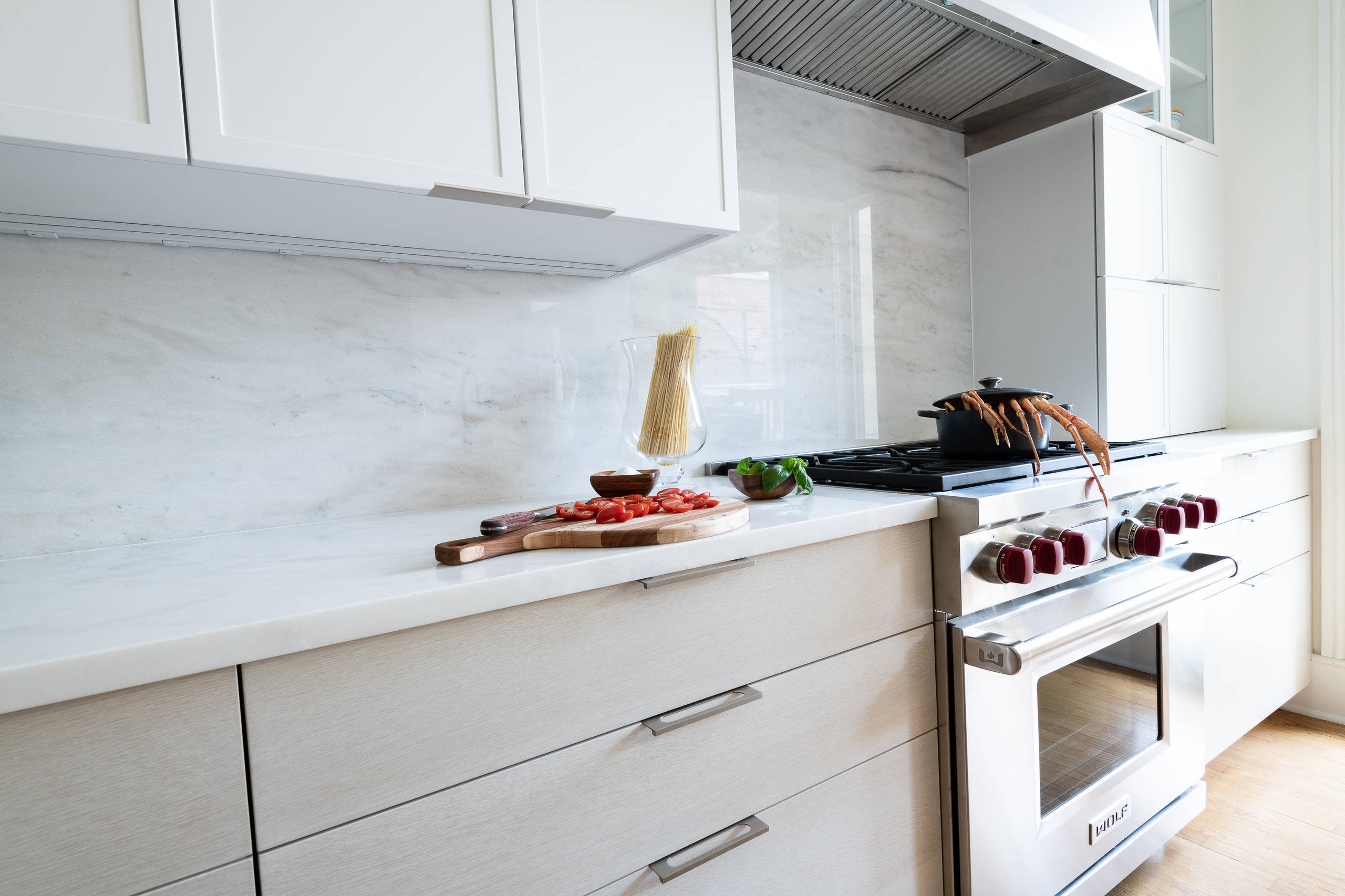 For this recently remodeled kitchen in Washington, D.C., Gilmer added edge pulls that are routed into the tops of the cabinets. “It’s a clean look that works well with contemporary or midcentury styles,” she says. “It also keeps the look of a kitchen simple and uncomplicated.”