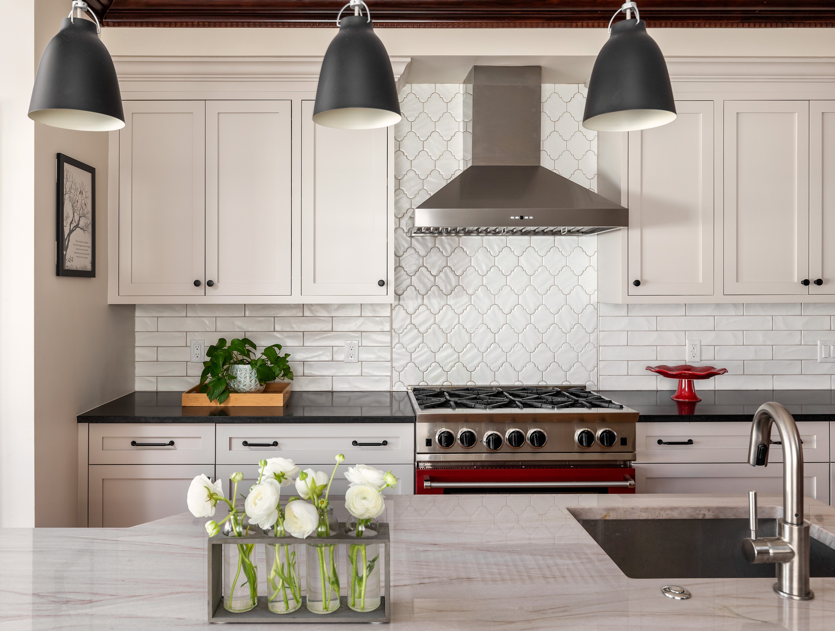 Swartz recently added Shaker-style cabinets to this remodeled Boston kitchen, which also features dark-stained wood ceiling molding and bright red appliances. “Very little goes out of style if a kitchen is thoughtfully designed and sympathetic to the home’s aesthetic,” she says.