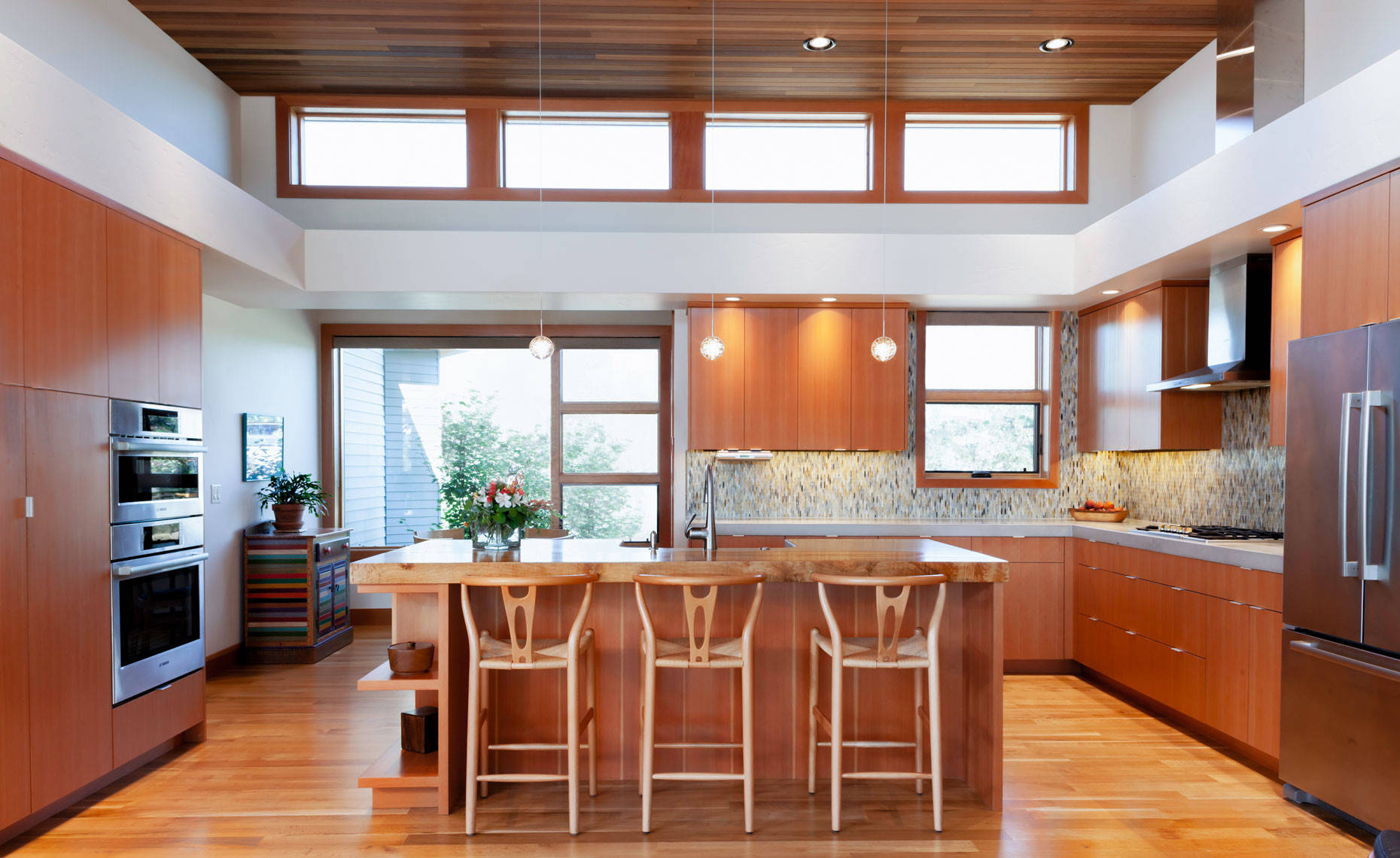 Smuland added stainless steel edge pulls to the stained wood cabinets in this recently remodeled kitchen in Bend, Oregon. “Edge pulls are pretty popular now because they are minimal with clean lines,” she says.