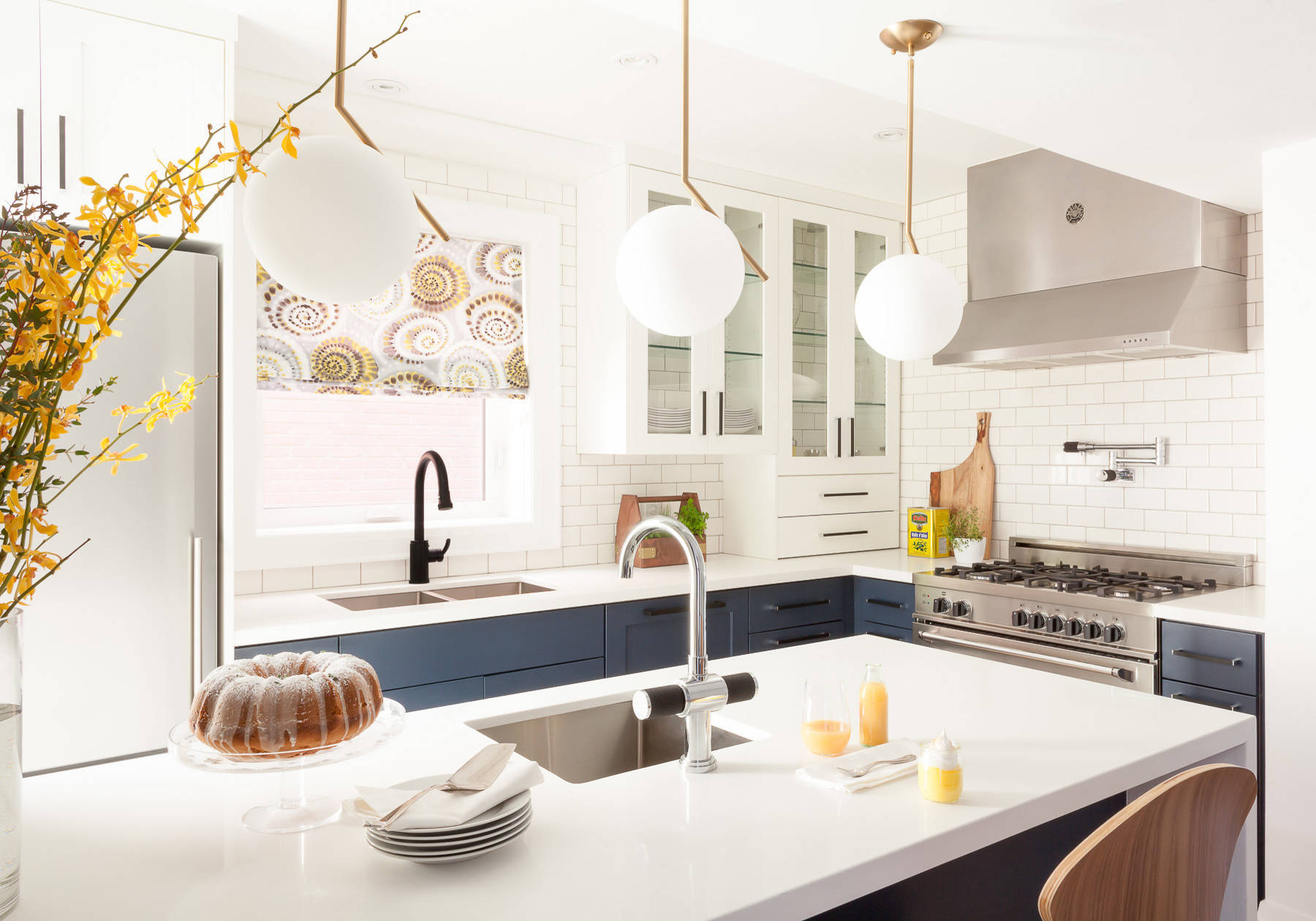 Designer Barbara Milner of South Hill Interiors in Toronto is also a fan of two-tone color schemes that feature blue and green lower cabinets, especially those covered in navy. “Put navy in any kitchen and it will work,” Milner says. “From nautical to farmhouse to modern, navy cabinets will introduce a layer of depth and richness to the design scheme.”