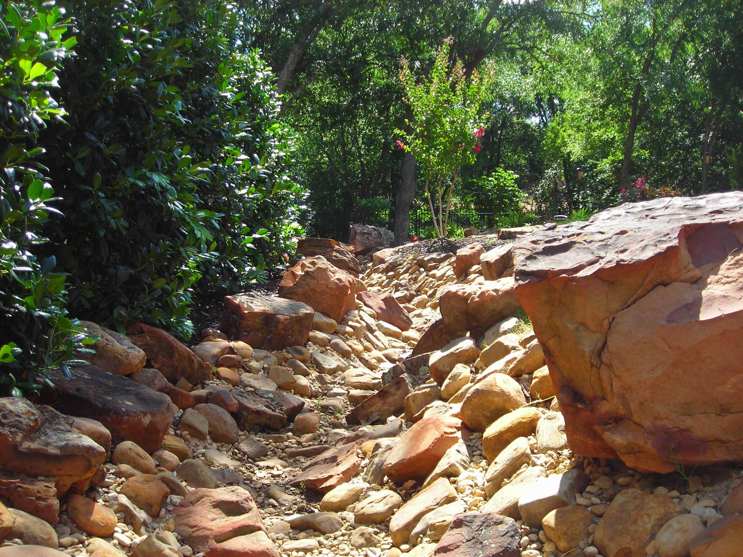There are untold numbers of drainage ditches among us that are having identity crises. They have been designed and built as dry creek beds, but they don’t quite measure up. True, they perform the duties of dry creek beds, carrying excess water away from structures to more appropriate areas. They do, however, lack that touch of artistic realism that would allow them to realize their full potential in terms of both function and form.