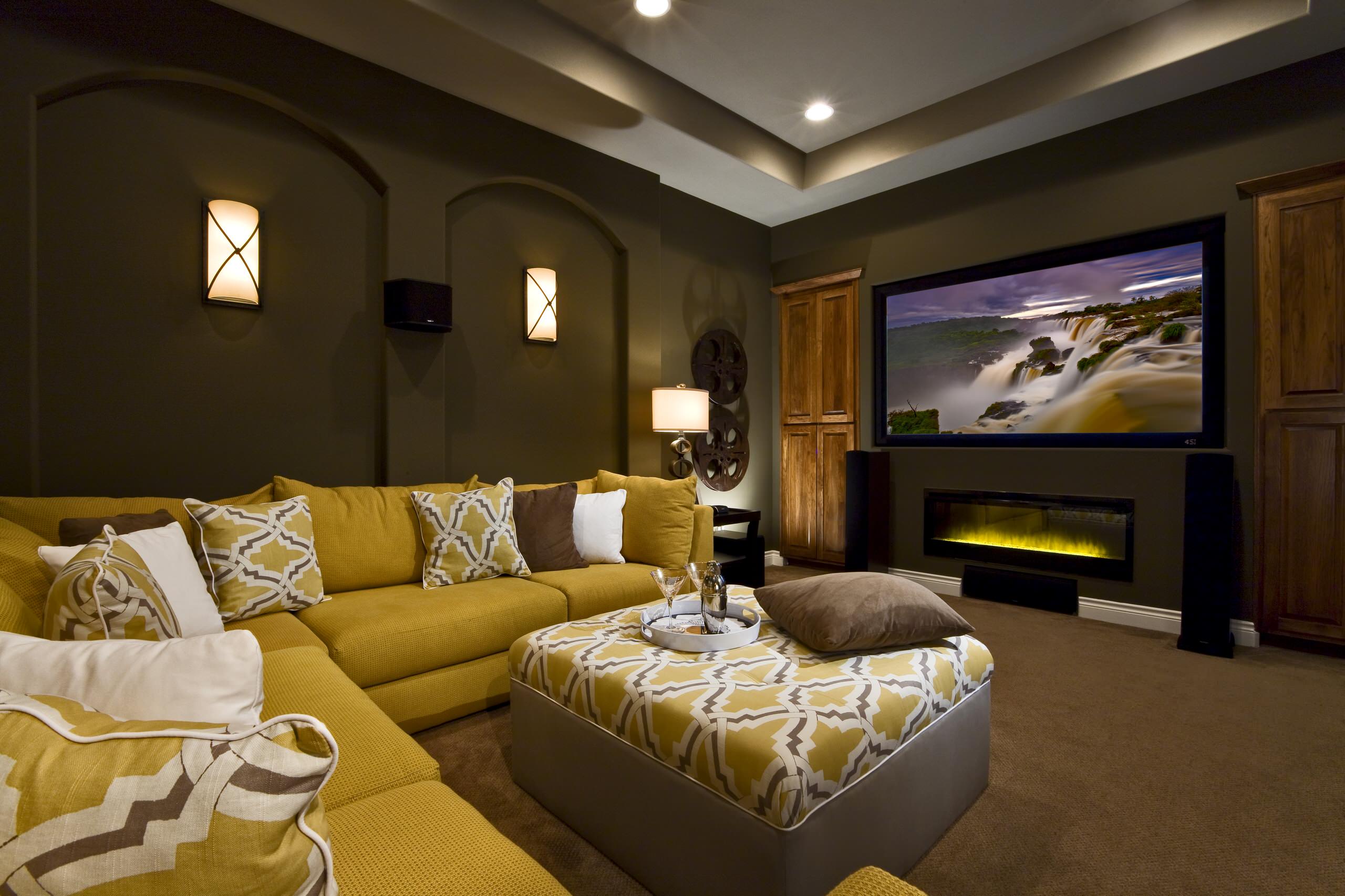 Set the mood. If you do have a projector-and-screen setup, keeping the room as dark as possible when you’re watching something usually helps with the contrast and quality of the image you’re seeing. But if you have a TV that can handle a little ambient light, Dewalt says wall sconces create a welcoming ambiance. “Wall sconces wash the walls with light,” she says.