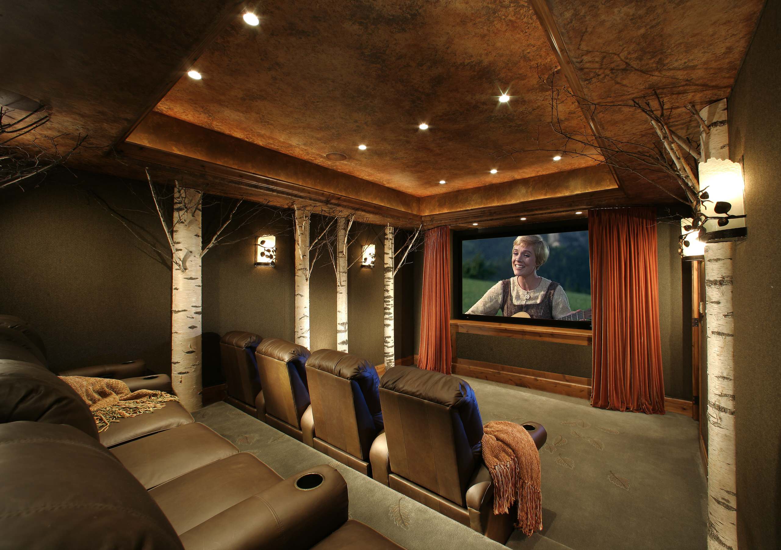In some high-end projects, more traditional or upgraded versions of movie theater seats (think cushy recliner instead of sticky felt seat) continue to be popular, she says, as do floor risers added to achieve the full effect.