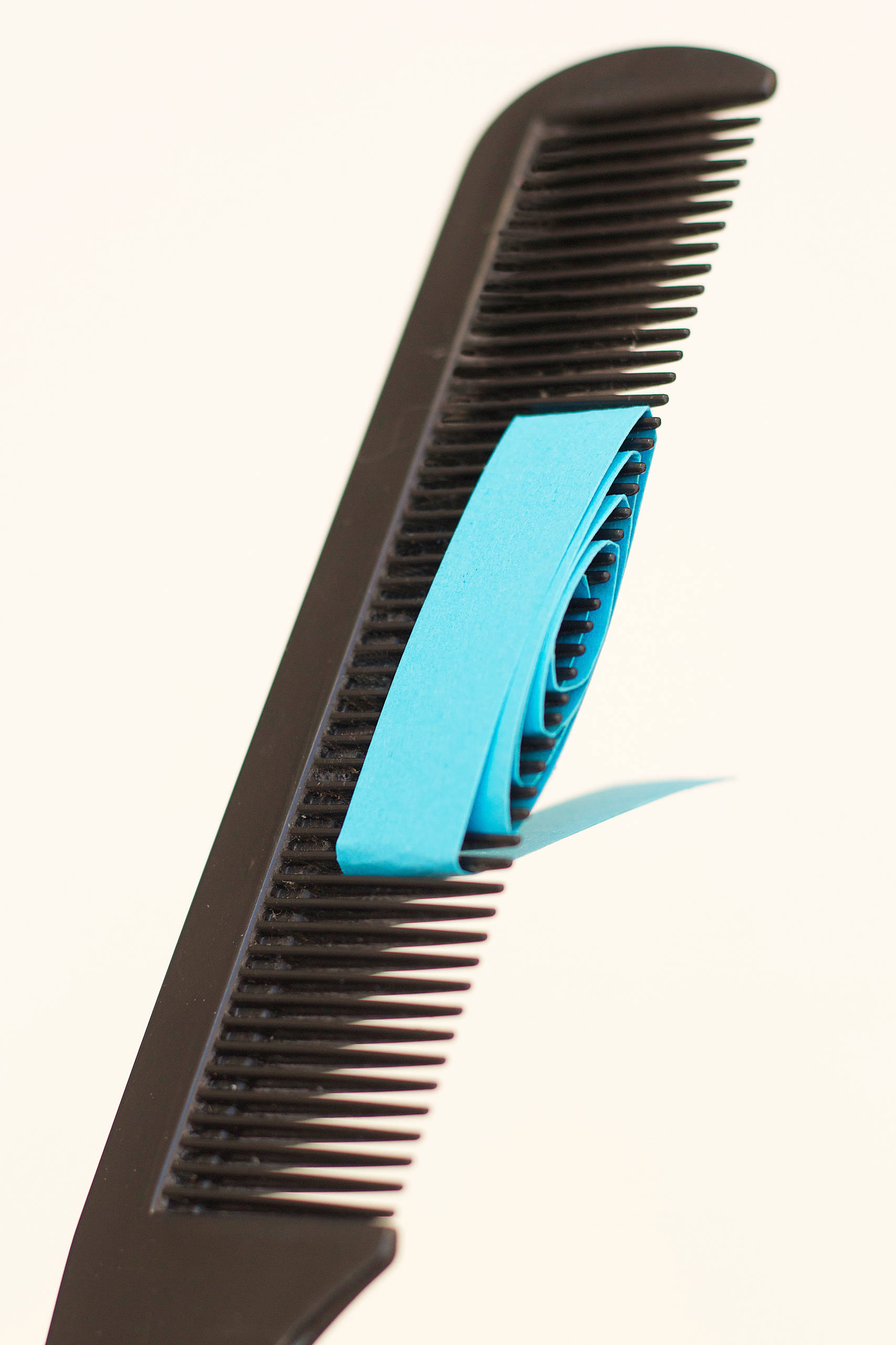 Wrap the end of a paper strip around four center teeth of a comb. As you make concentric rounds, skip two teeth on each end. Secure the tail with glue and gently slide the shape off the comb.