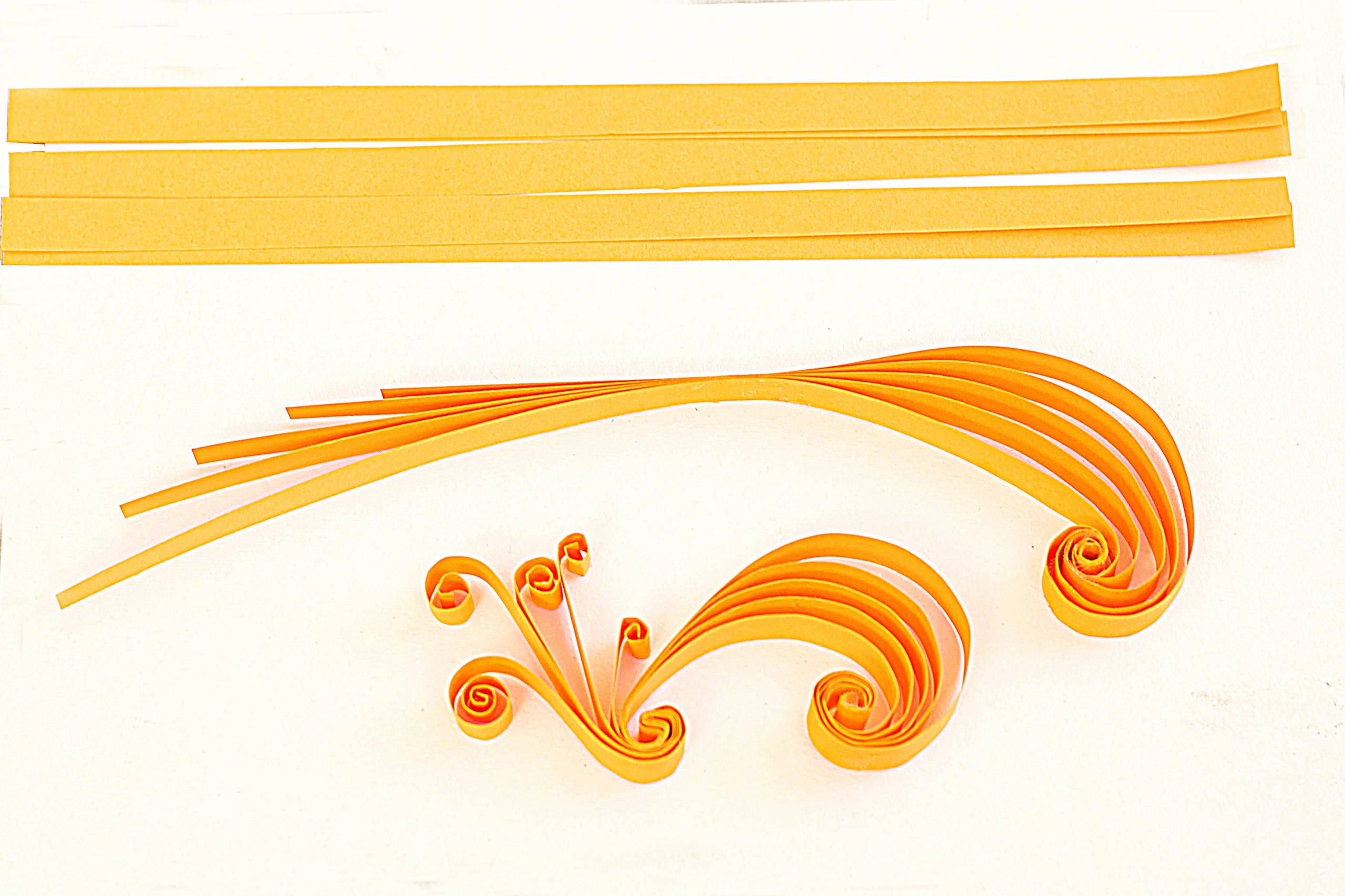- Quilling strips, ⅜ inch wide by 11⅝ inches long, cut from an A4 sheet of card stock in orange, yellow and blue