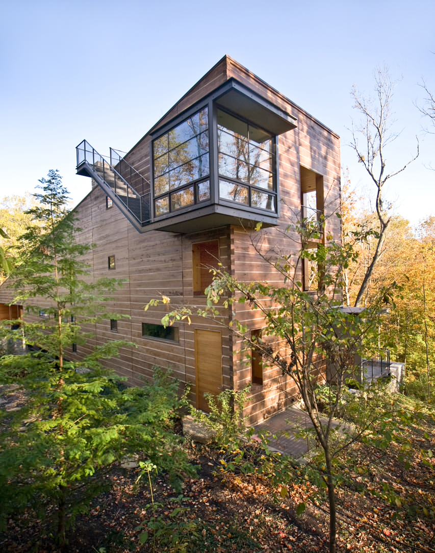 The corners of this contemporary home have enormous pins and tails, which are the alternating projections of a dovetail joint.