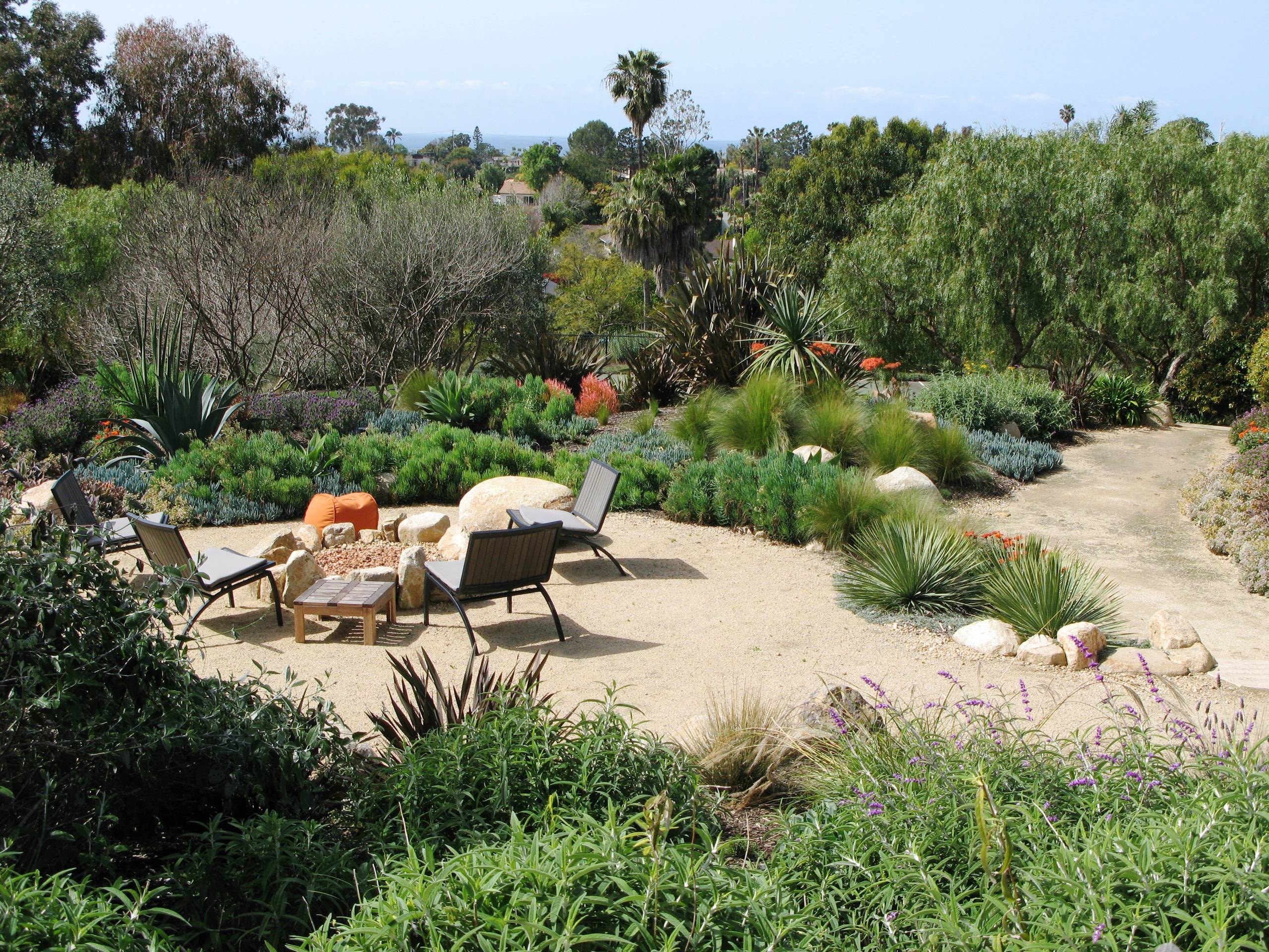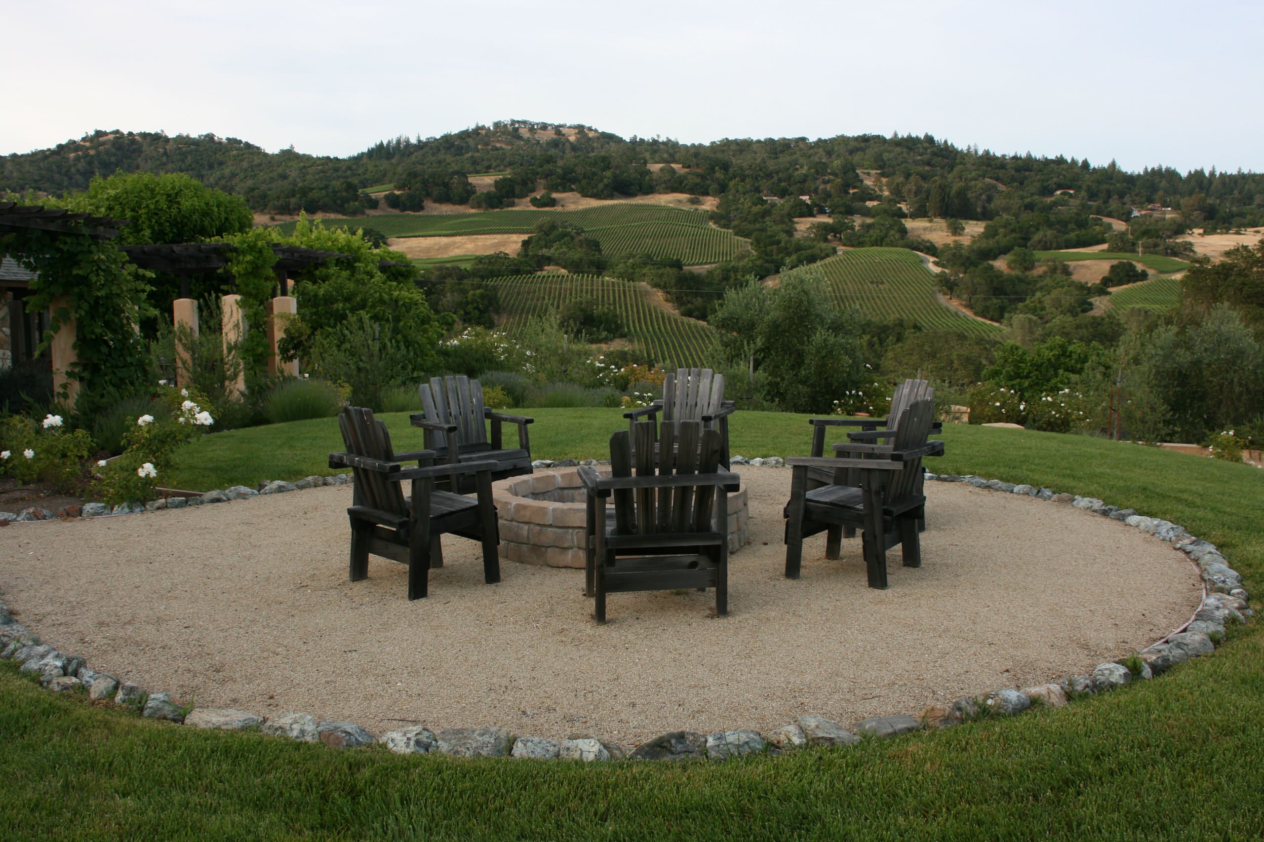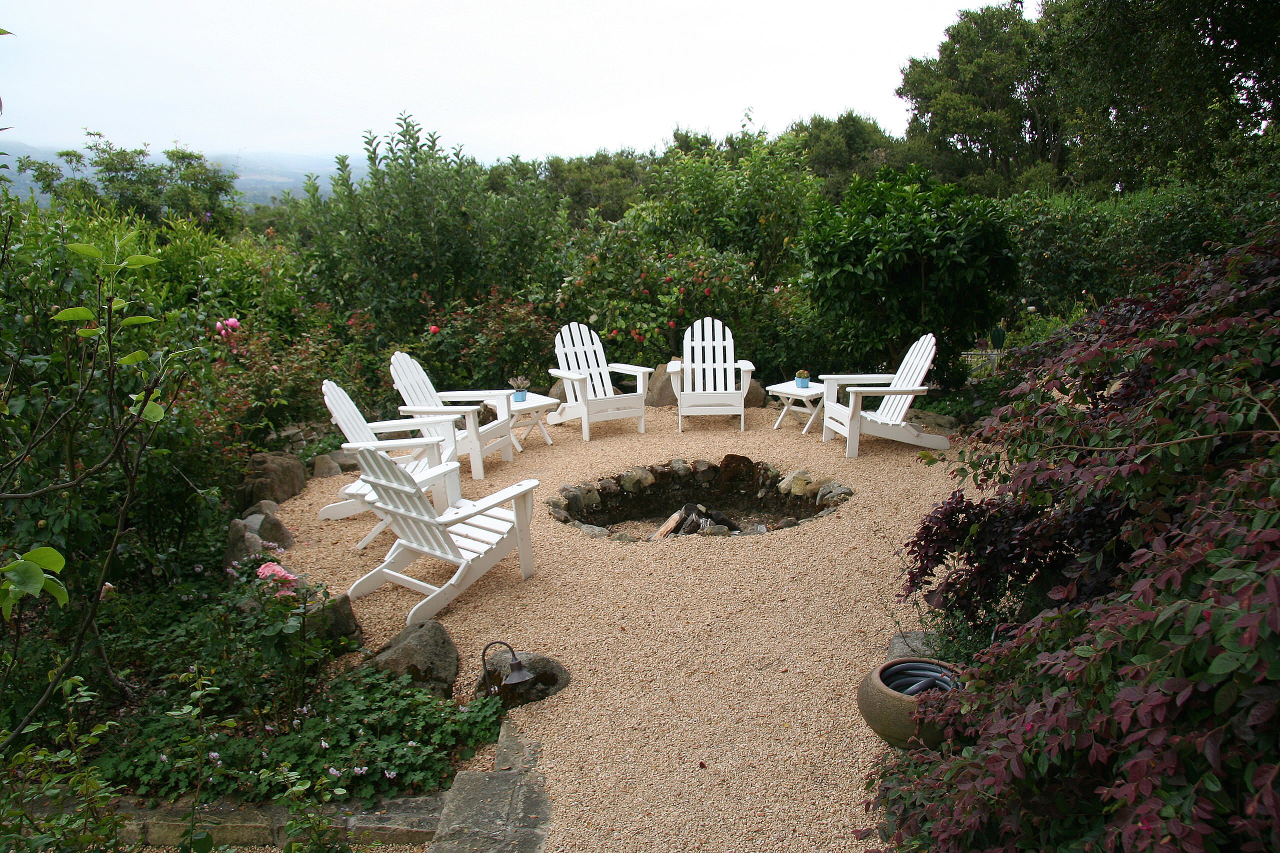 The decomposed granite and stone border that separates this fire pit from the greenery beyond is a smart safety precaution, particularly in drier climates.