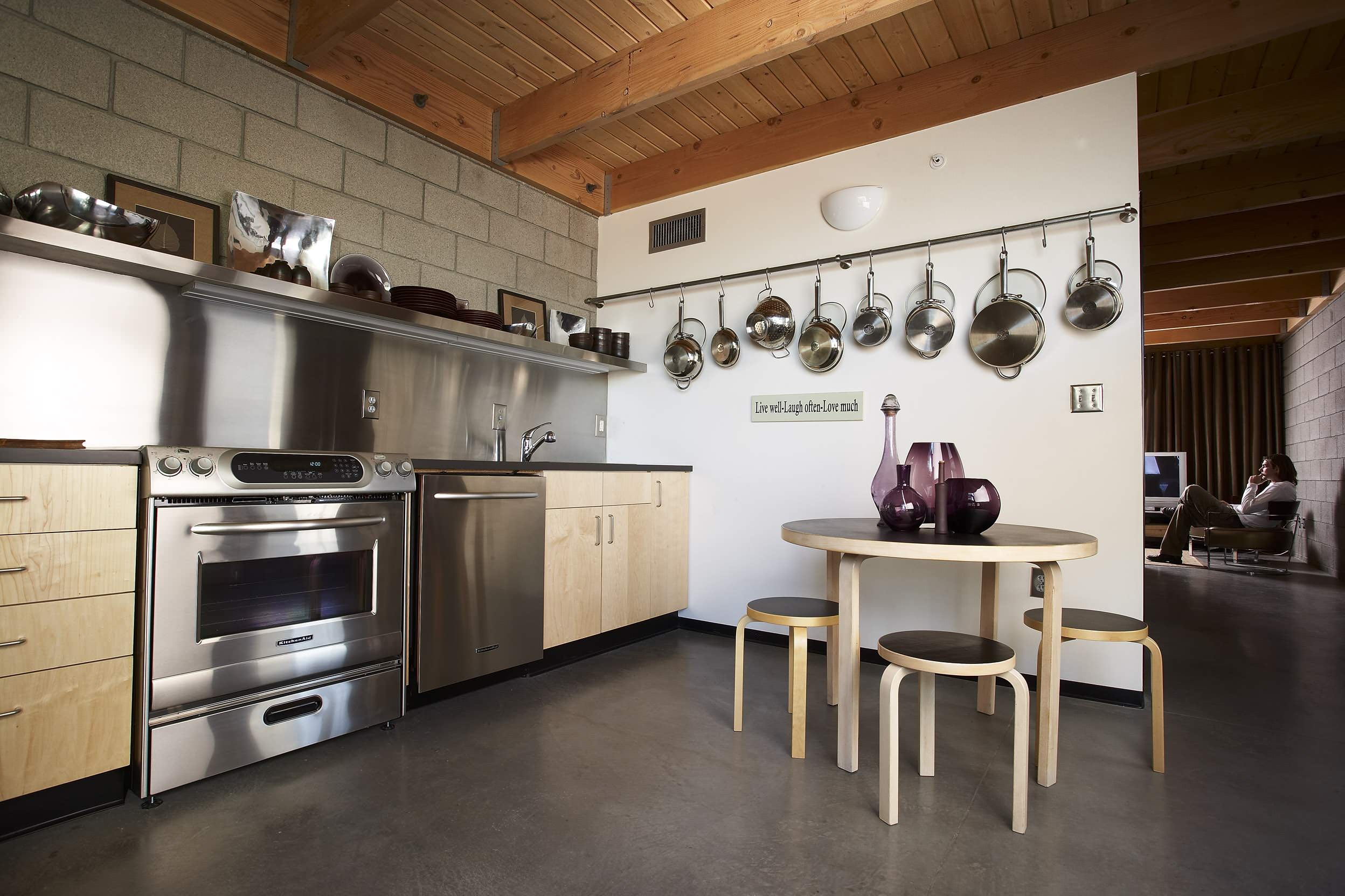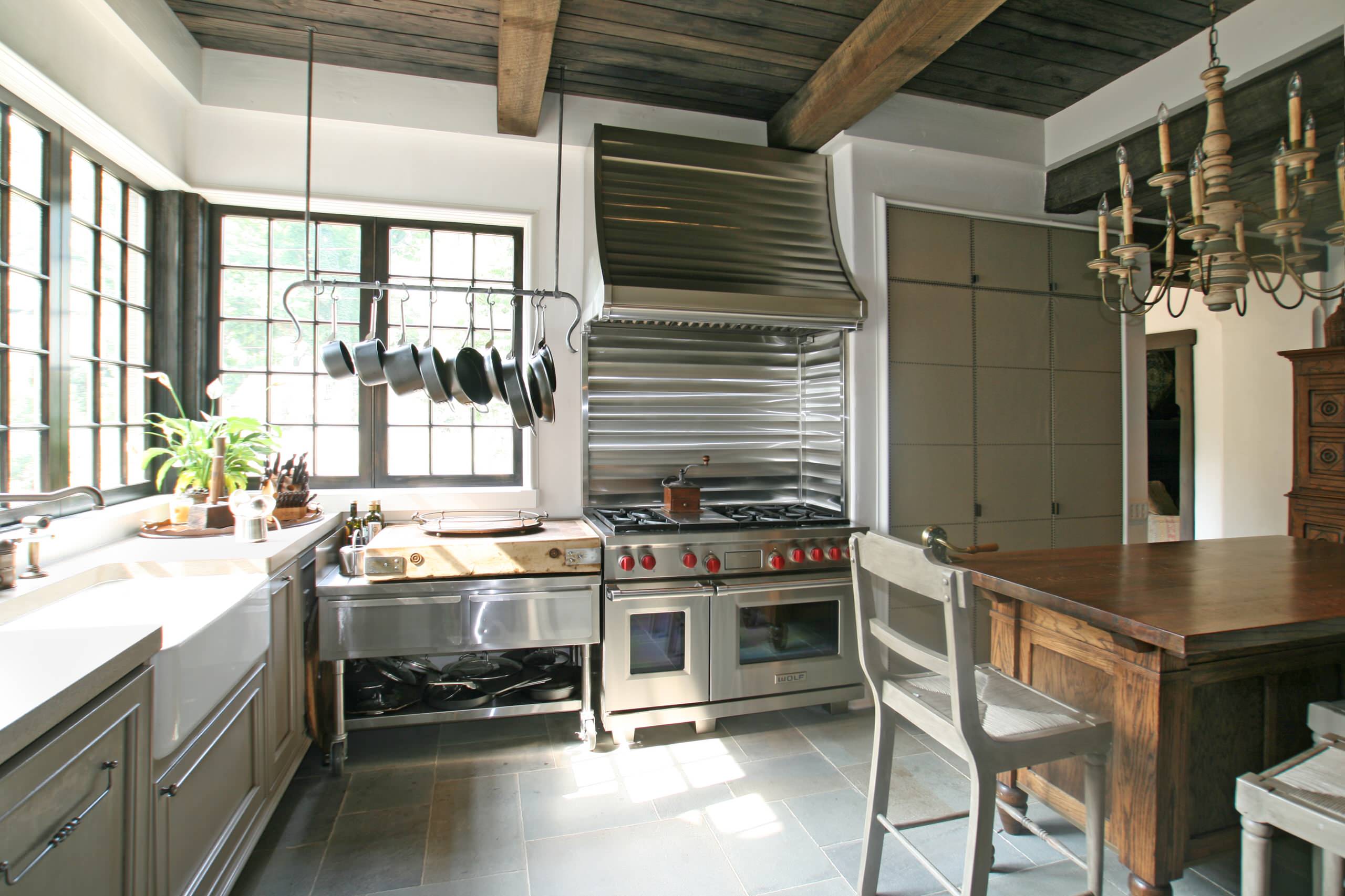 1. Professional worktable. This kitchen is the first one I remember seeing that had a commercial kitchen worktable worked into an eclectic cottage design. The table serves as worktop, peninsula and eat-in surface, and plays nicely off the serious range and vent hood.