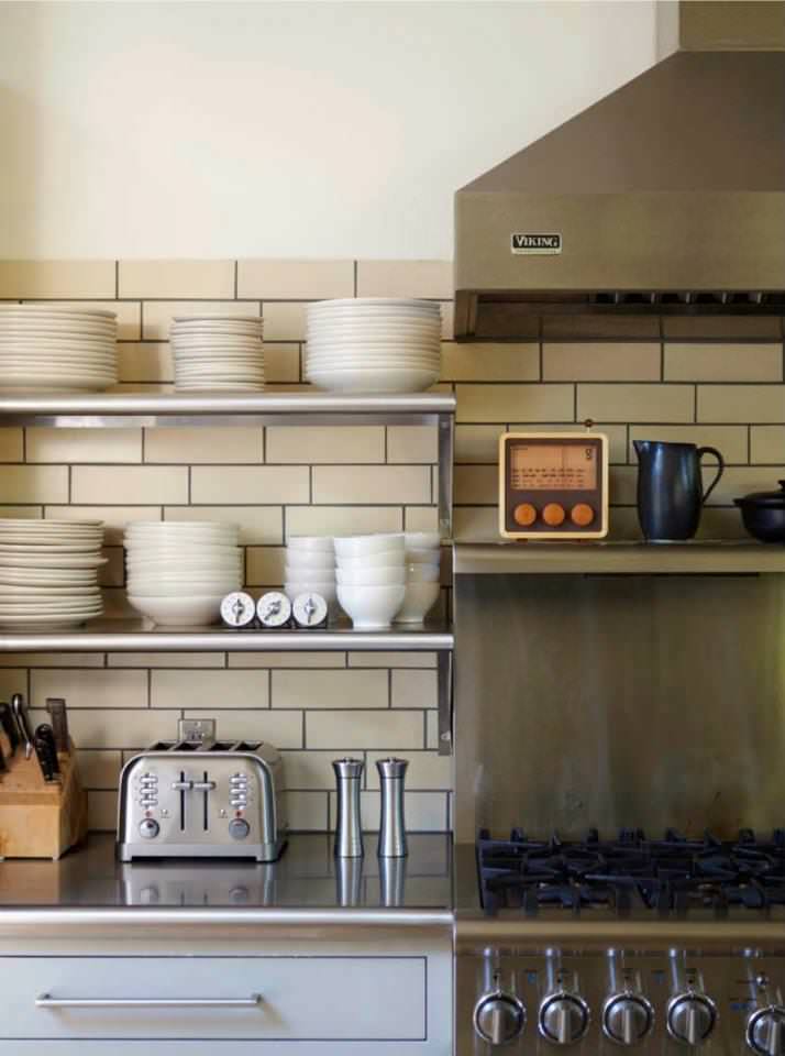 2. Open shelves of supplies. Whether in a diner or French bistro, I’ve admired the neat stacks of restaurant-grade bowls, plates and mugs on open shelves many times. Add home kitchen personality by accessorizing with salt and pepper shakers, a quirky timer and other small pieces you love.