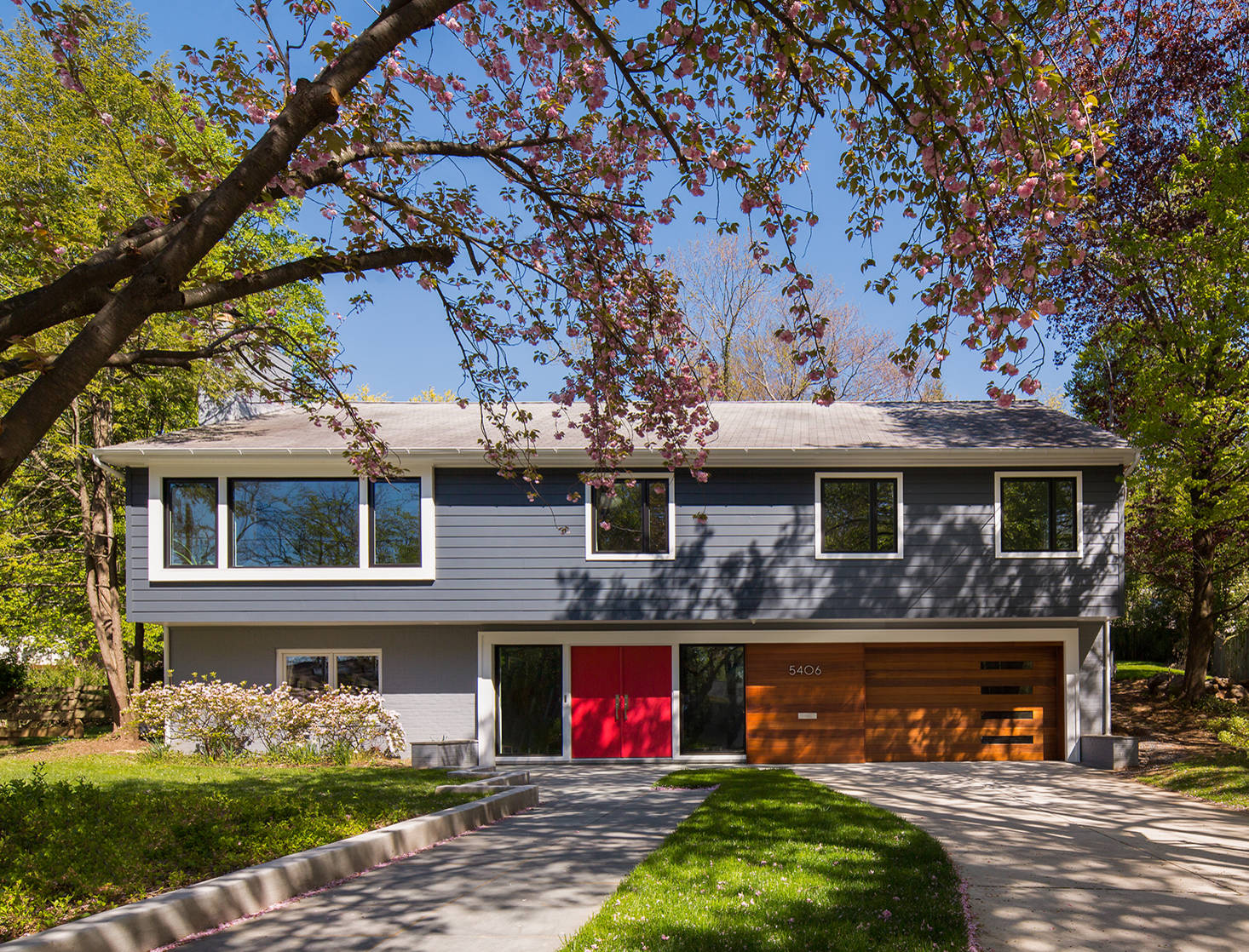 Being a child of the ’80s, I spent many of my formative years in split-level or raised ranch style homes. I was never a huge fan of them, but I love the look of this one and may have to reevaluate my dismissal of this style. Clearly, with the right color scheme it can look fresh and modern. A duo of cool blue-gray hues helps to break up the boxiness of the home, giving it a sleek and linear appearance.