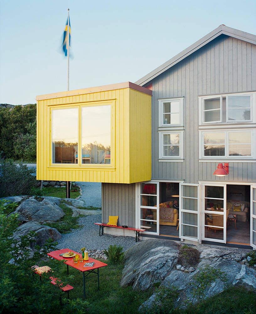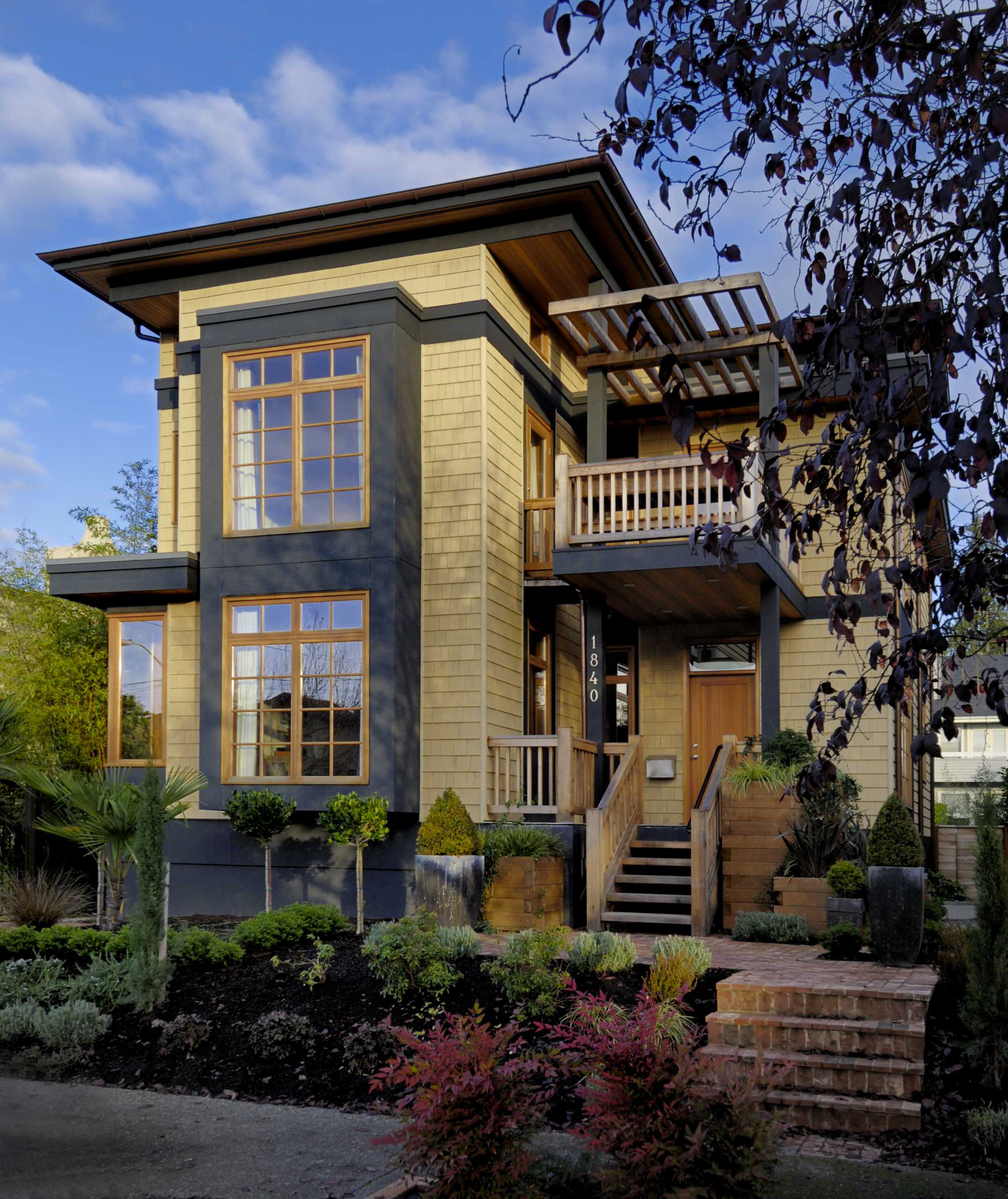 A two-tone exterior color scheme looks right at home on contemporary architecture. You also have the freedom to go quite bold with color on this style of home — the vibrant citrus yellow is a great choice here. I like how this bold hue is paired with a soft neutral gray and how all of the other elements are kept simple to support rather than fight with the dazzling color.