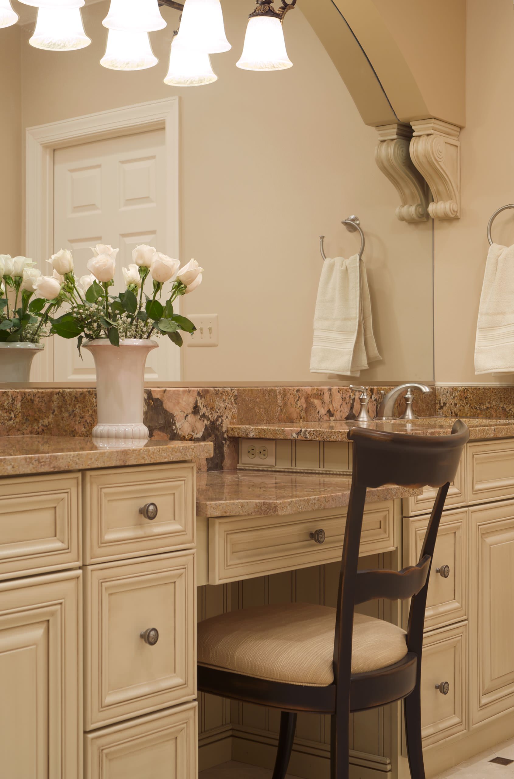 Bathroom counters. The standard height for bathroom counters is 34 to 35 inches. If you have a built-in vanity, such as the one shown here, the vanity should drop down to 30 inches to accommodate a regular chair. Regular chairs have a standard seat height of 17 to 19 inches.