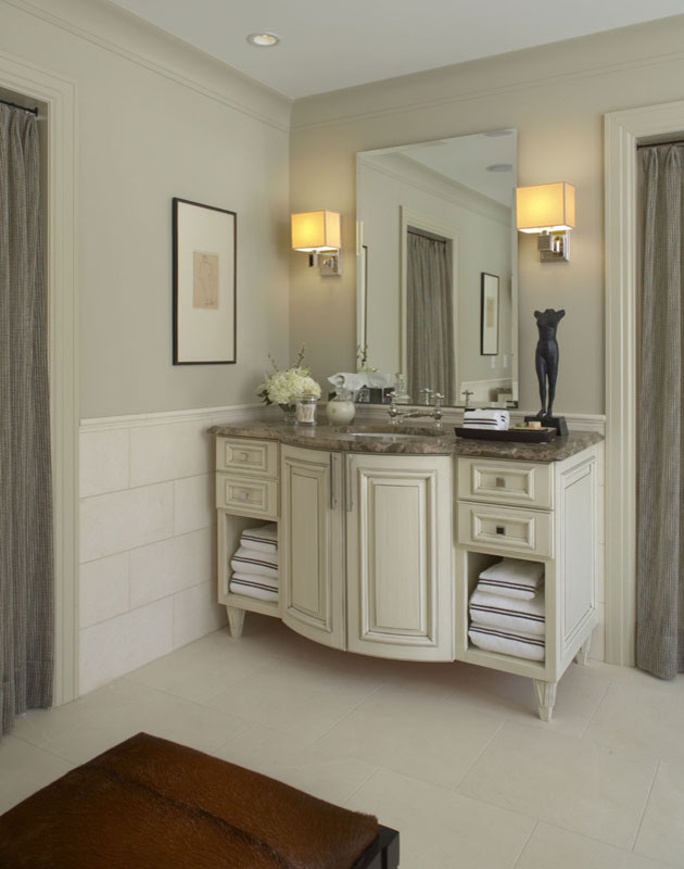 Wainscoting. Tile or wood wainscoting in bathrooms is set to standard height at 45 to 48 inches. This typically allows for the vanity or cabinets to be placed just under for a clean, uniform look.