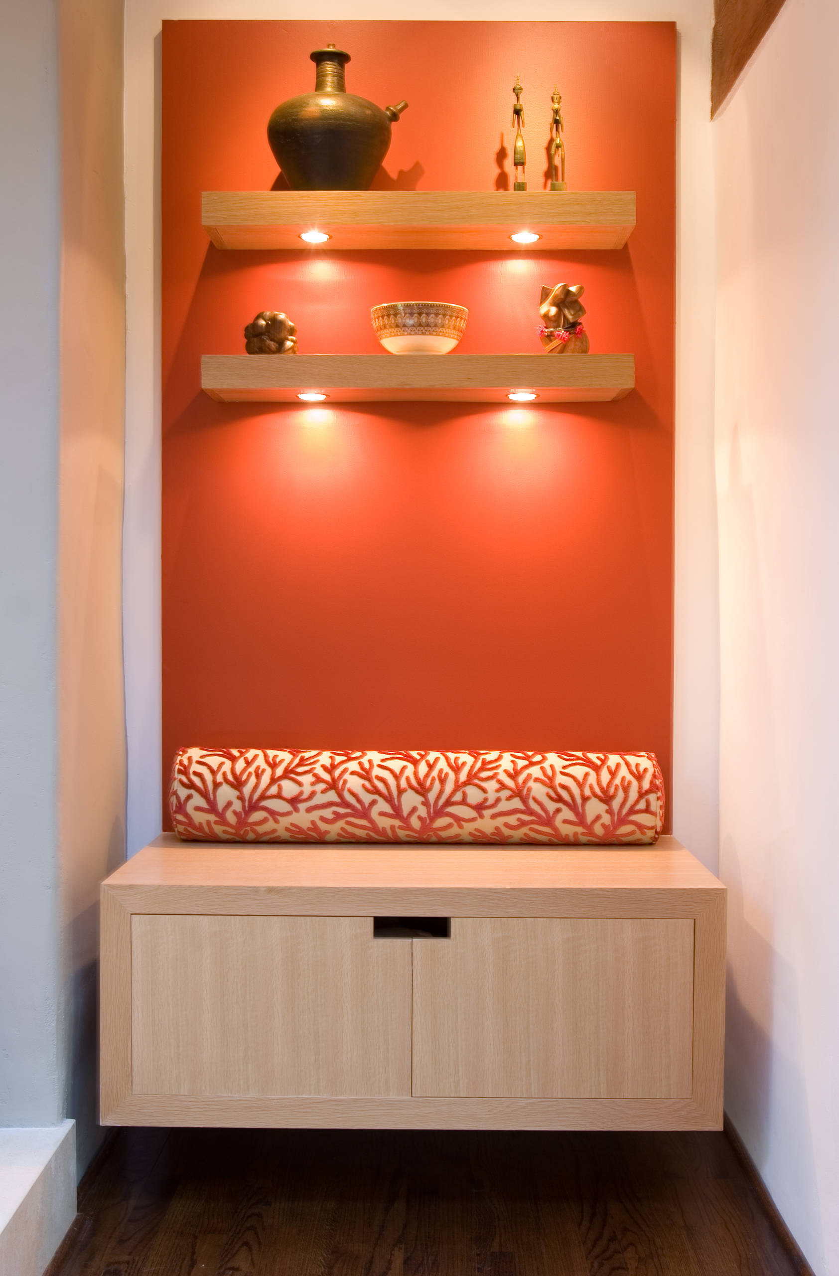 I love this vignette — the print teamed with the coral wall is simple but bold.