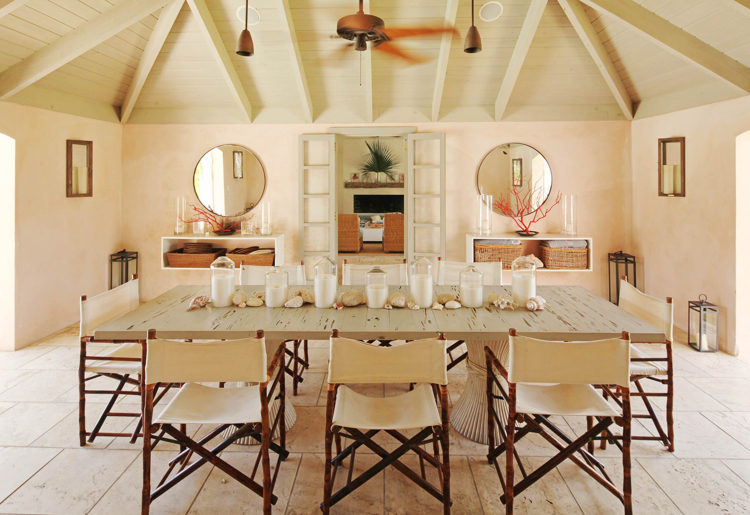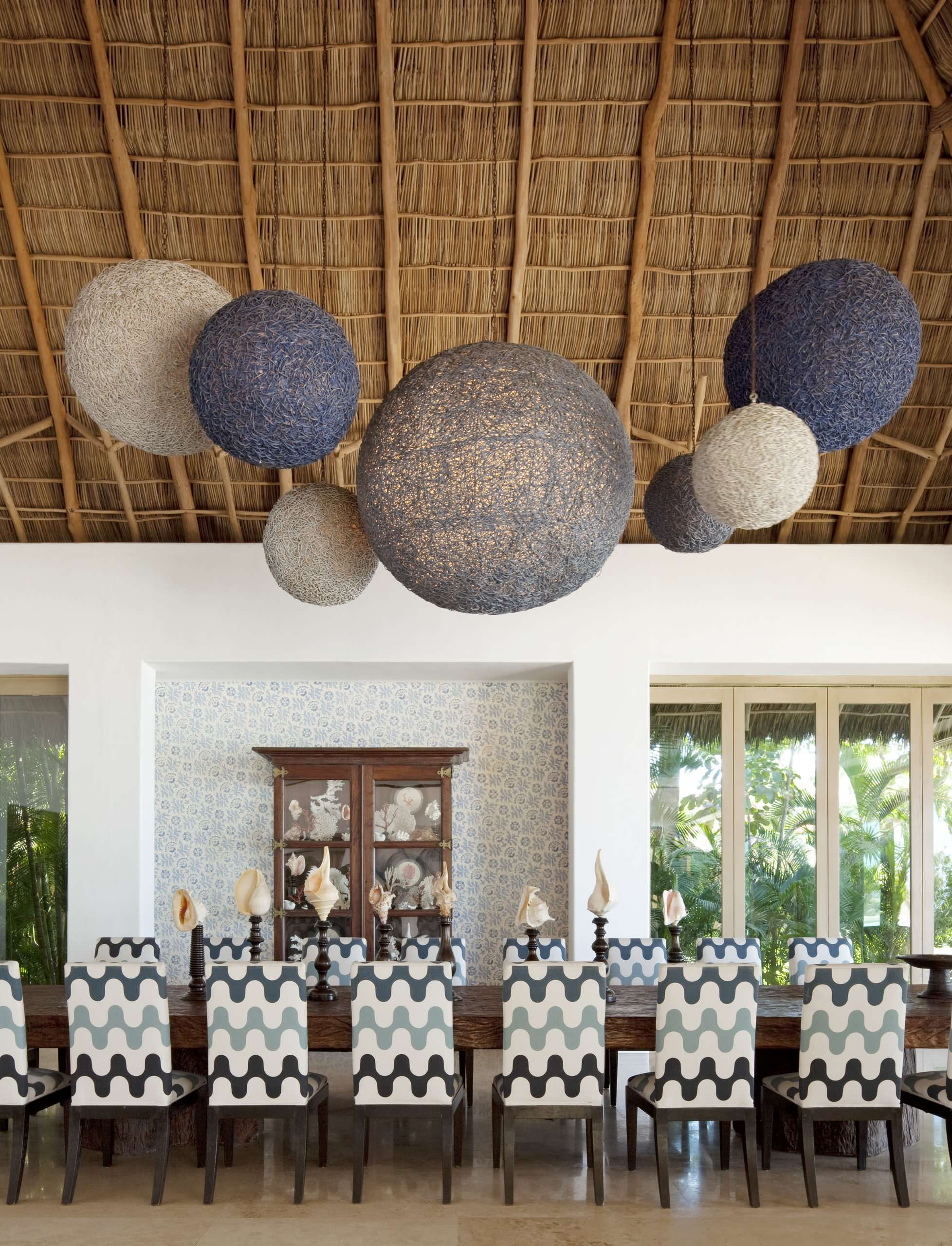 This chevron fabric in ocean colors works perfectly with the woven lampshades and the rattan ceiling. Mix materials but try sticking to the same color palette for a consistent, contemporary look.