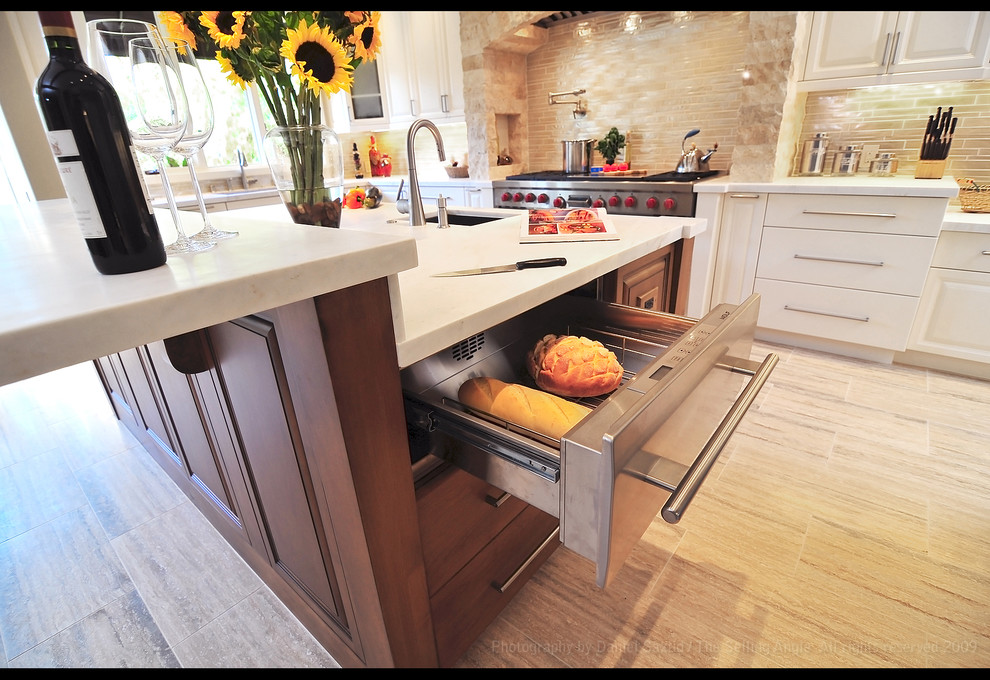 The short end of a kitchen's island typically goes unused. A warming drawer is a smart use of that space.