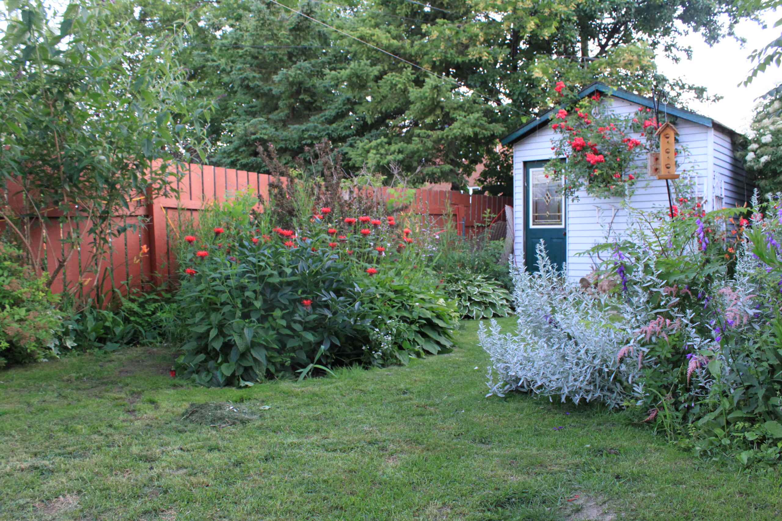 If you’re lucky enough to have a colorful flower garden, consider a fence with a tint that reflects the plantings, like this red one does.