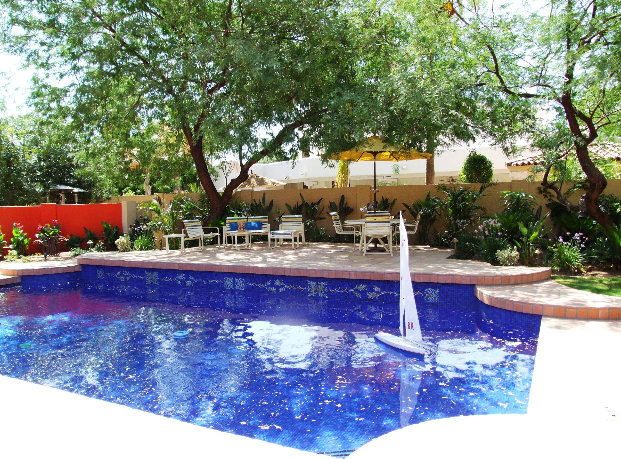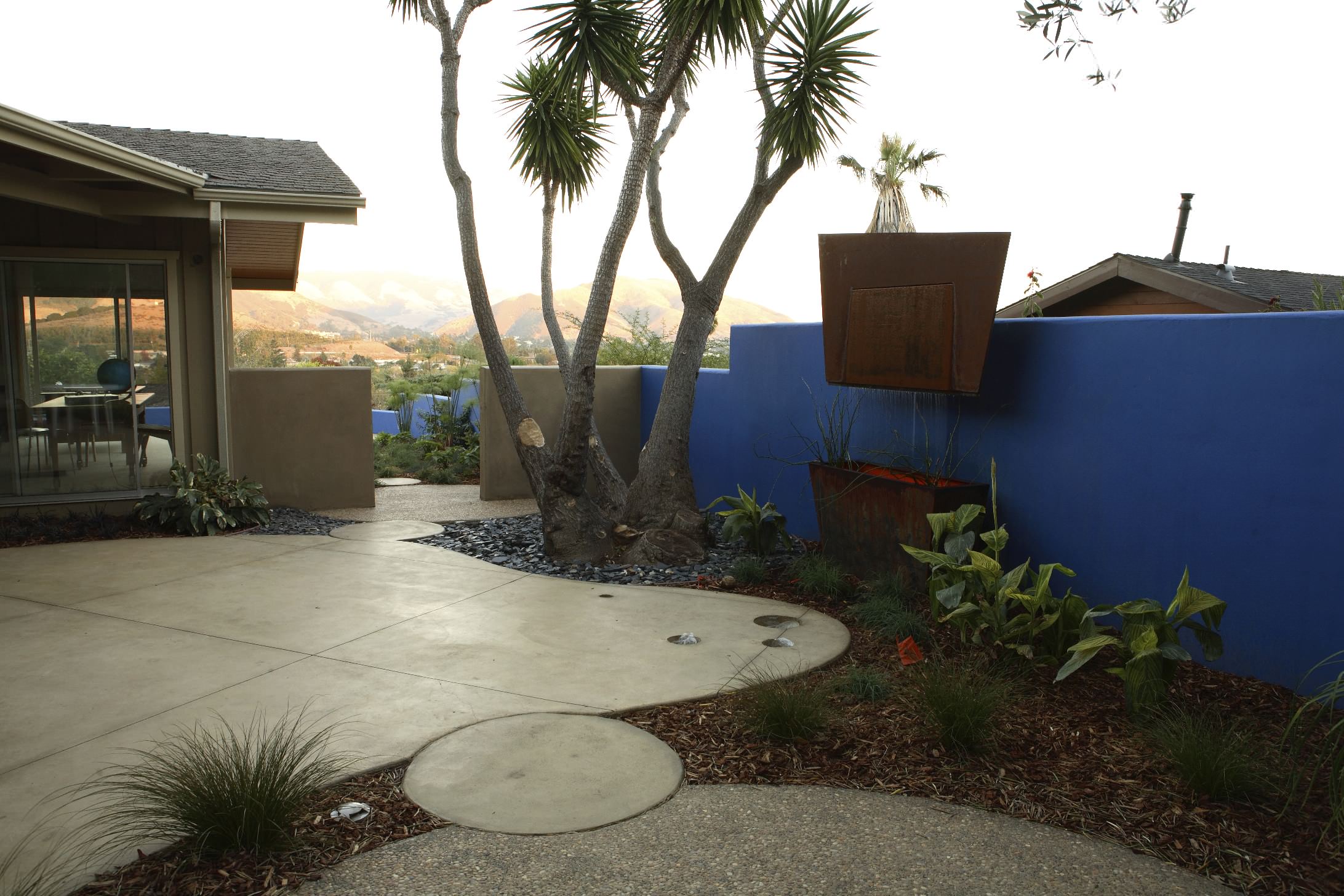 Do you feel like your backyard decor is just missing something? Try going bold with color! Here, a vivid shade of blue creates a splash in this ranch’s backyard.