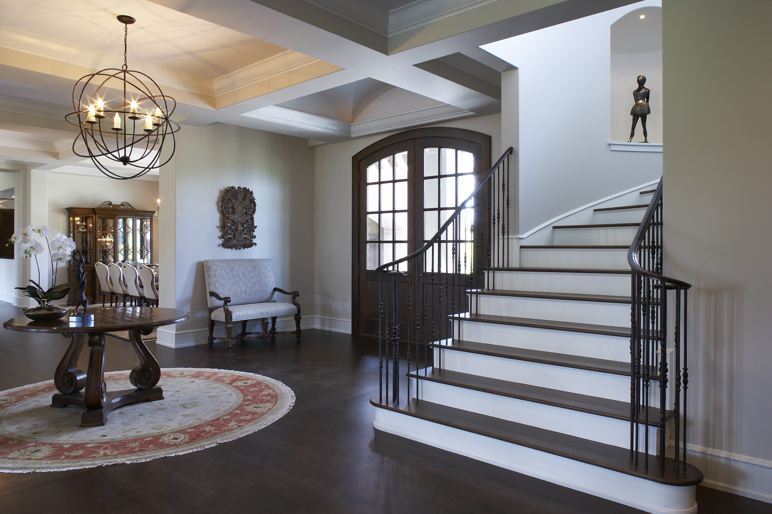 Even the grandest entryways need seating. This pretty upholstered bench fits right in with the stately feel of the space.