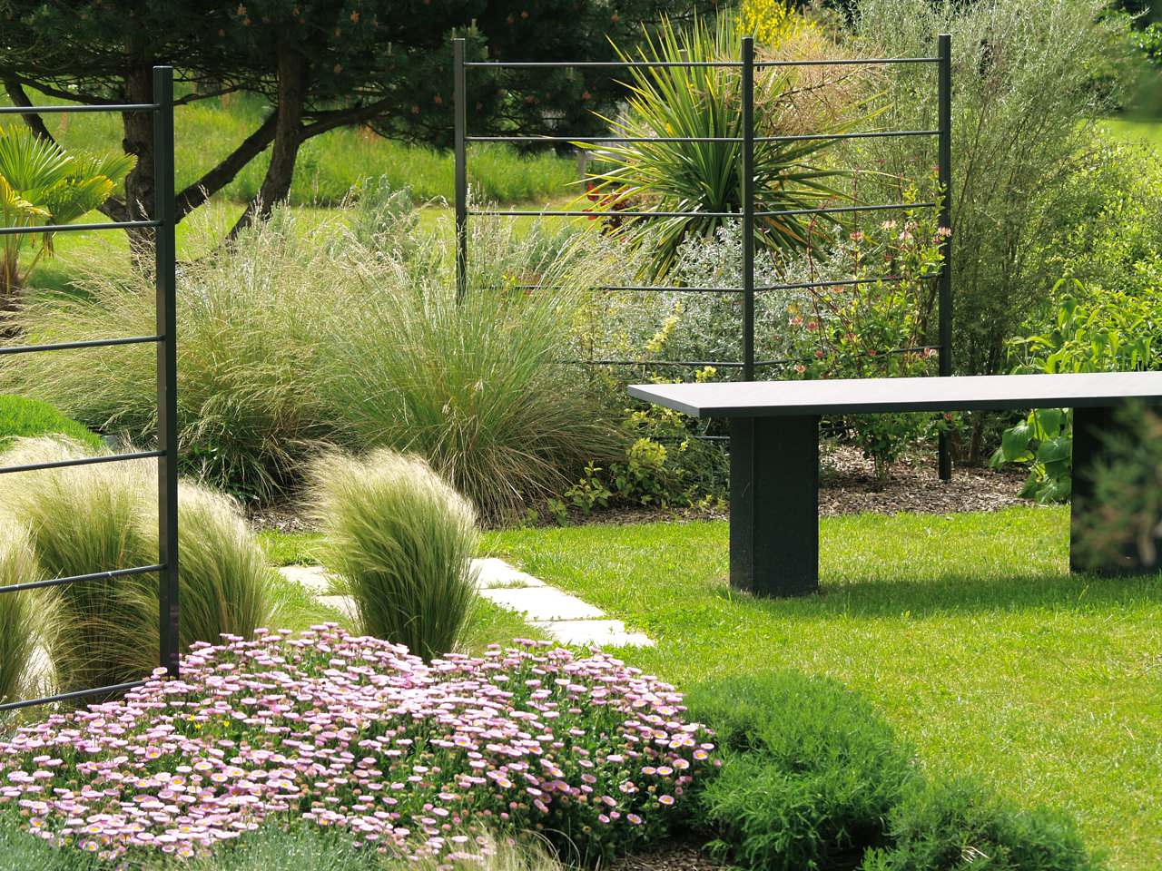 Tight clumps of ‘Karl Foerster’ feather reed grass act as a translucent screen around a patio. Though a cool-season grass, its seed heads can remain attractive well into winter.