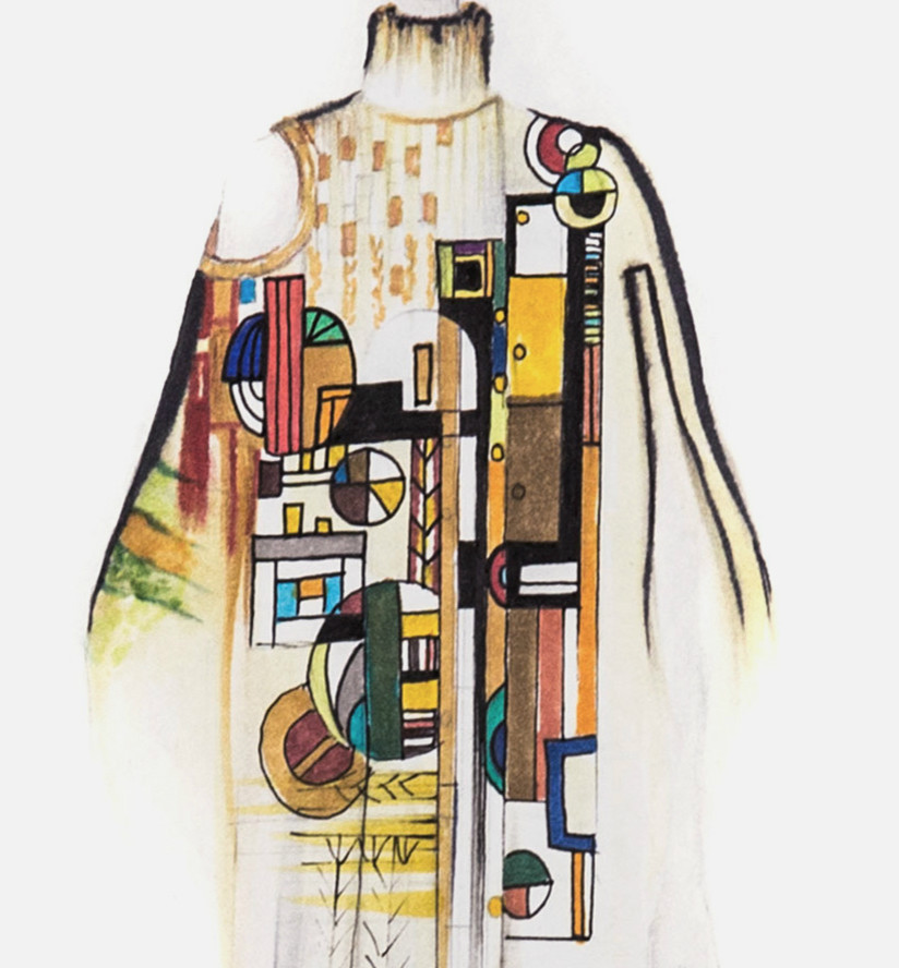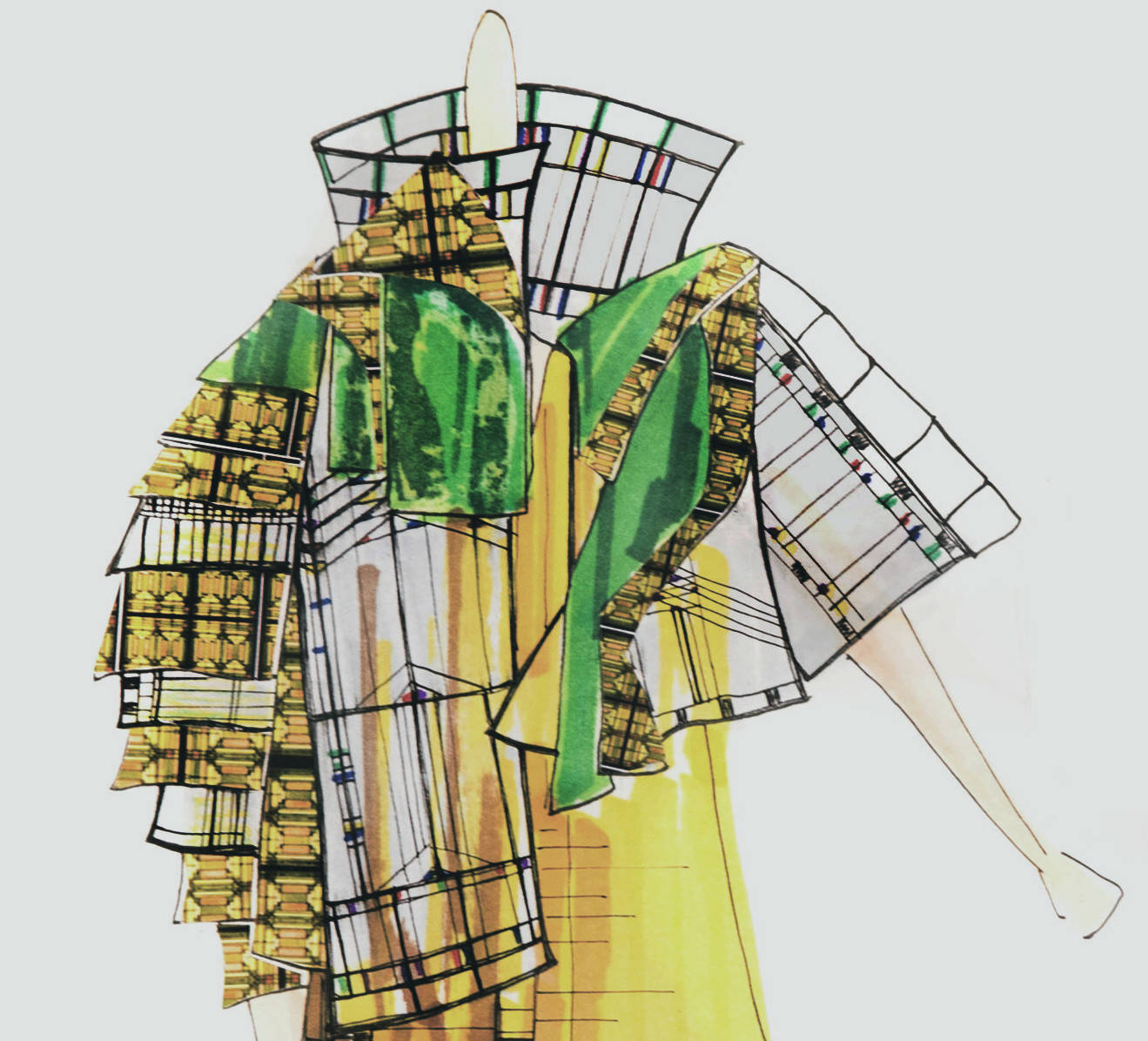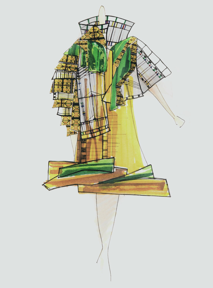 The structured nature of Lin’s garment is meant to reflect the simplicity and order of Wright’s architecture. The color palette, too, is deliberate. “The overall color palette of my design is earthen colors, with brown representing wood and ground, green representing plants and life. All the colors are meant to evoke an air of serenity.”