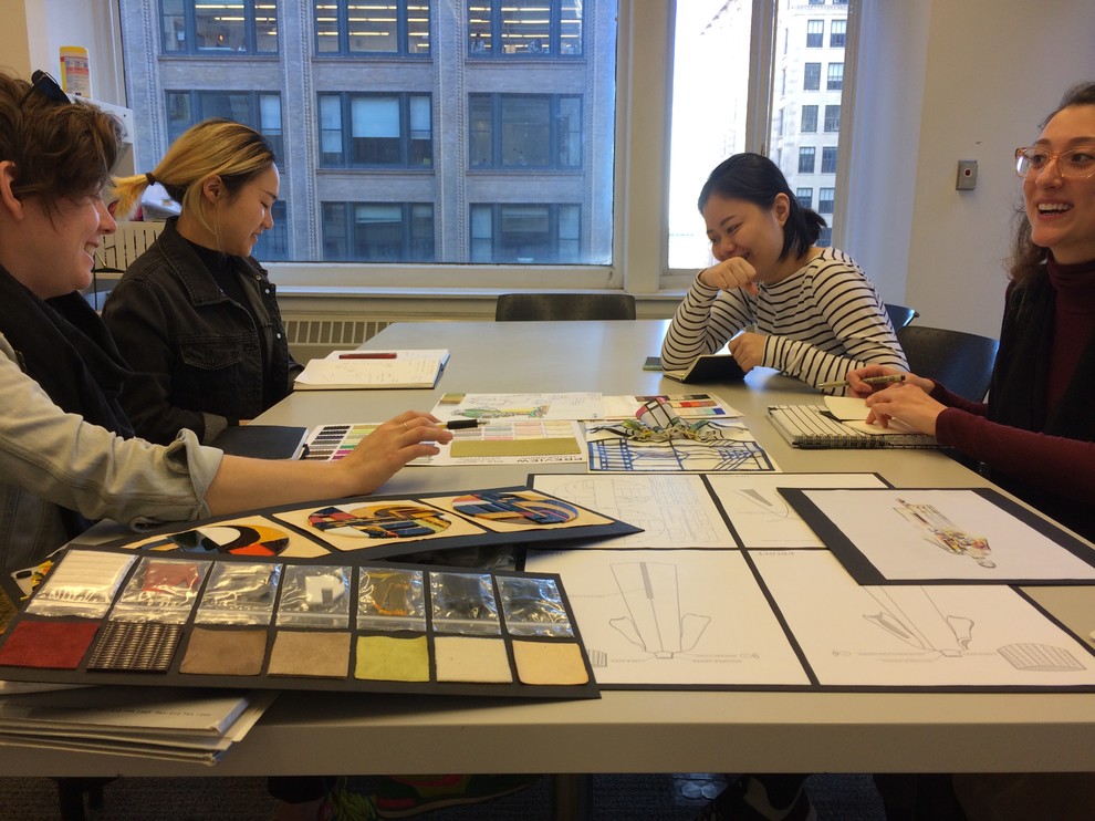 Students Hana Chang and Xinyi “Teresa” Lin, center left and right, discuss the fabrication of their winning garments for the Wright 150 Fashion Design Awards.