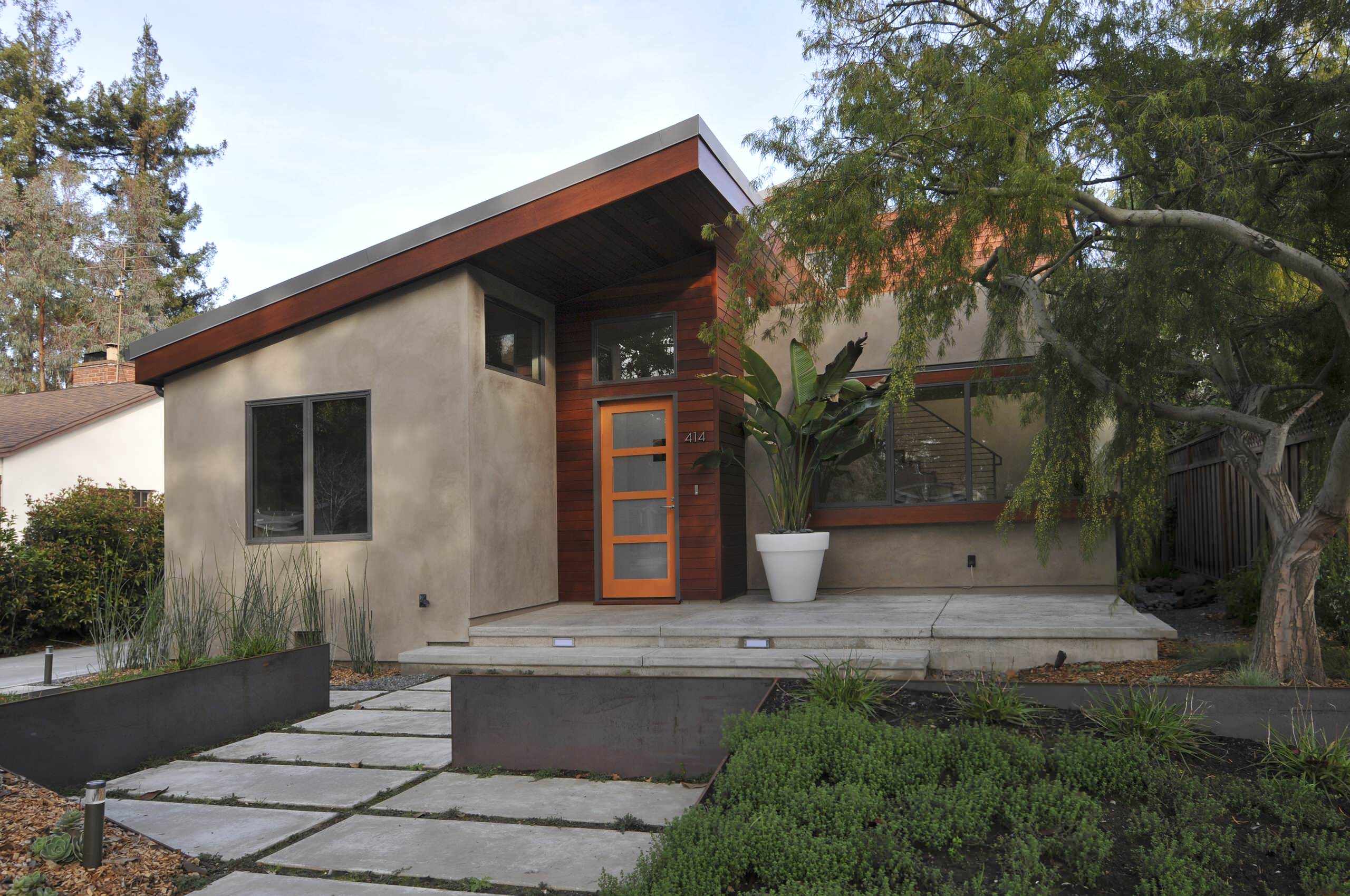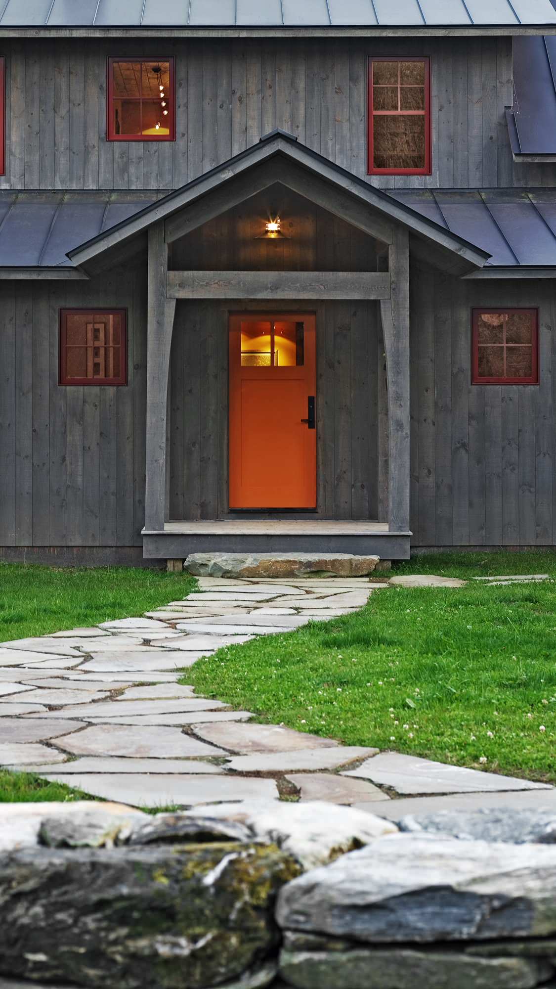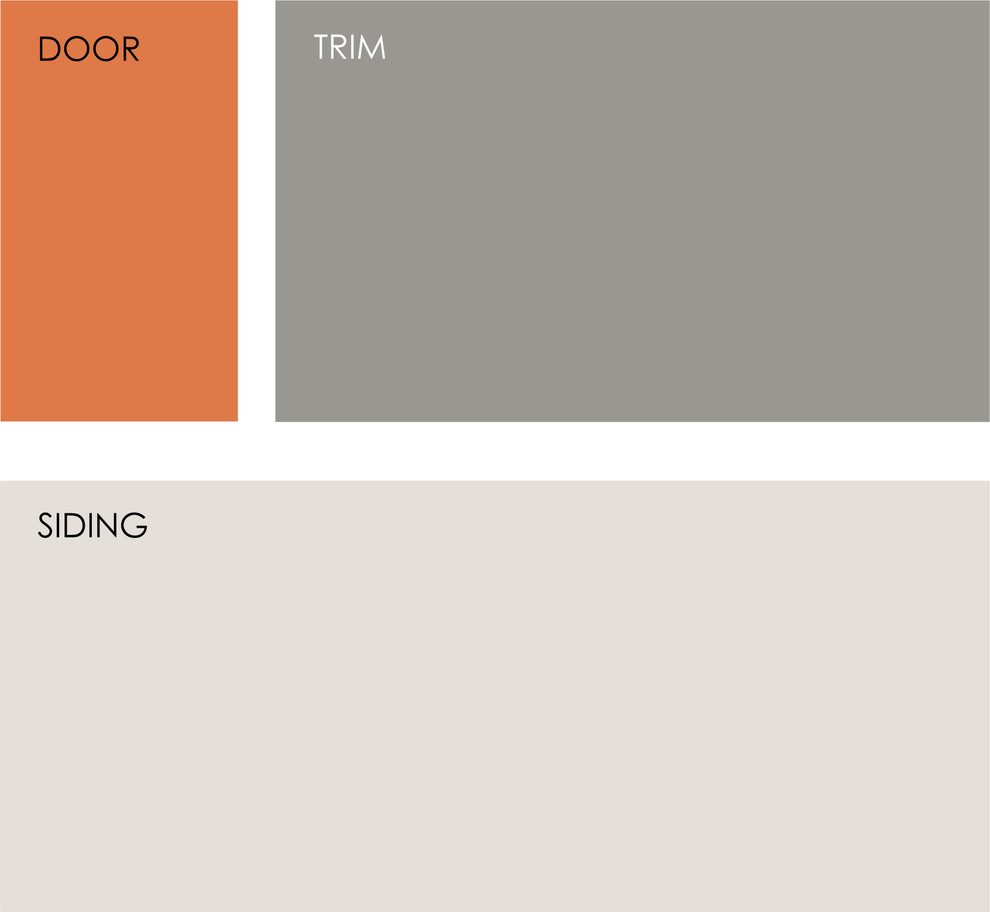 This eye-popping shade of orange is not for the timid. But it works here because the siding and the trim are cool, soothing neutrals that support rather than compete with the bold hue.