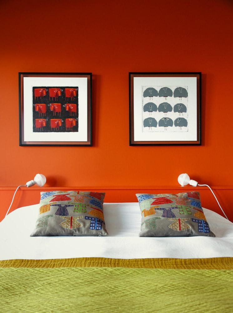Dans cette chambre gaie et chaleureuse décorée par l’agence Castillon-Fourreau, le vermillon sert de fond et de note principale à un jeu de couleurs subtil et travaillé. En bas, la literie d’un vert ambré, avec un léger liseré or bronze ; au centre, des coussins aux motifs multicolores ; en décor, enfin, ce mur intense avec un dégradé délicat s’éclaircissant vers le bas et se densifiant vers les hauteurs. La décoration joue sur un minimum d’objets pour un maximum de symétrie et d’originalité avec ces deux cadres muraux surplombant les coussins, l’un orné de taureaux stylisés rectangulaires sur fond noir et dont le rouge répond à l’éclat fruité du mur, l’autre accueillant des moutons en demi-cercle d’un gris faisant écho au fond des coussins brodés, les figures de chaque tableau étant disposées en carré trois par trois. Avec ce jeu de couleurs et formes très ornementé et structuré, sans surcharge cependant, on obtient un petit espace reposant et douillet, agréable et joyeux, doté d’une touche arty.