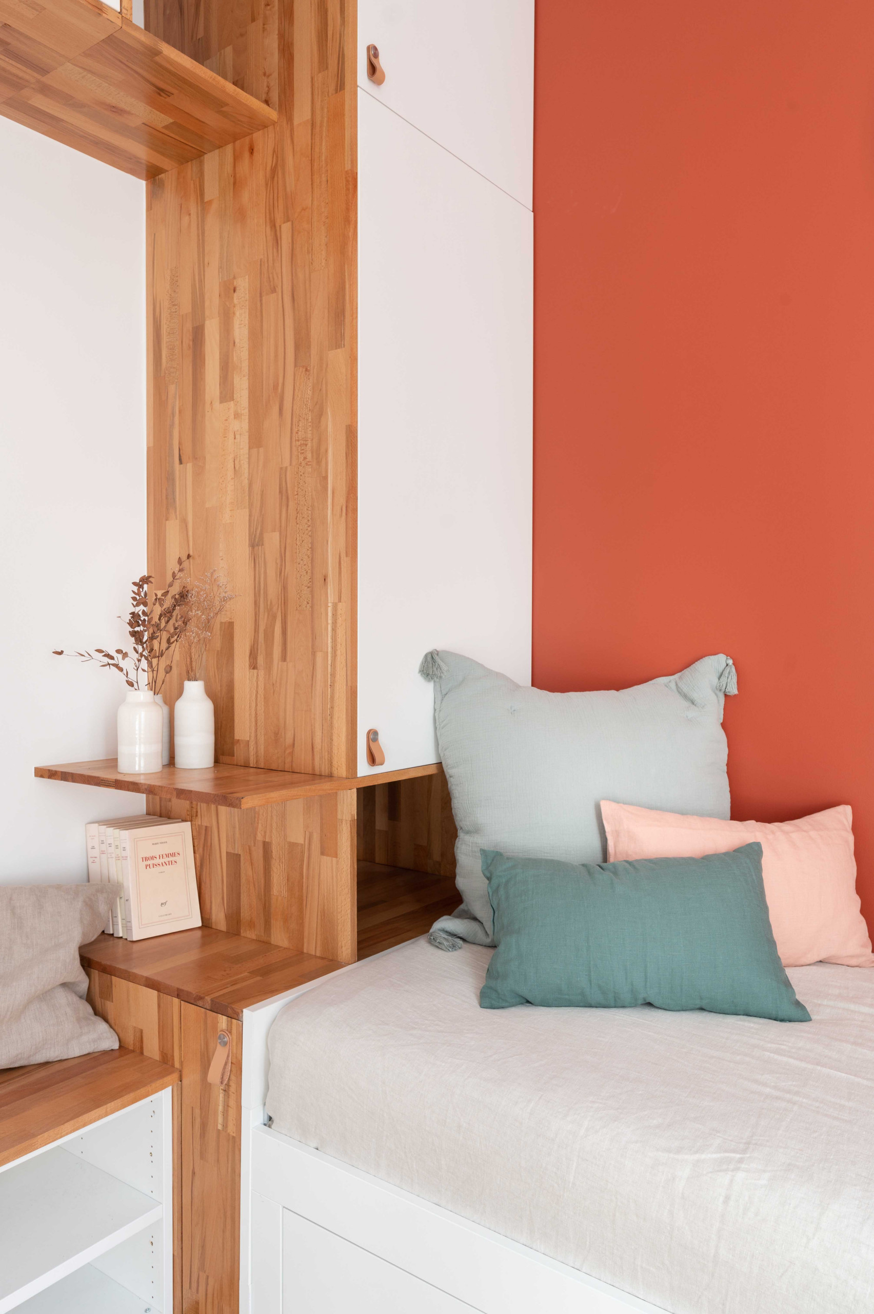 Malgré sa teinte éclatante marquée, le vermillon peut être associé à des couleurs autres que neutres, si elles sont choisies avec discernement. Ici, il résonne en association avec un trio de coussins aux douces nuances dans ce coin salon travaillé par Marie-Sophie Donnedieu : vert sauge, saumon clair, gris de lin, le tout sur un décor simple et naturel aux notes blanc et bois. Dans ce studio épuré, ce beau rouge orangé, aux échos discrètement terriens, réjouit et complète l’ambiance en colorant de tons vifs le mur du fond, derrière cette zone confort revêtue de pastel.