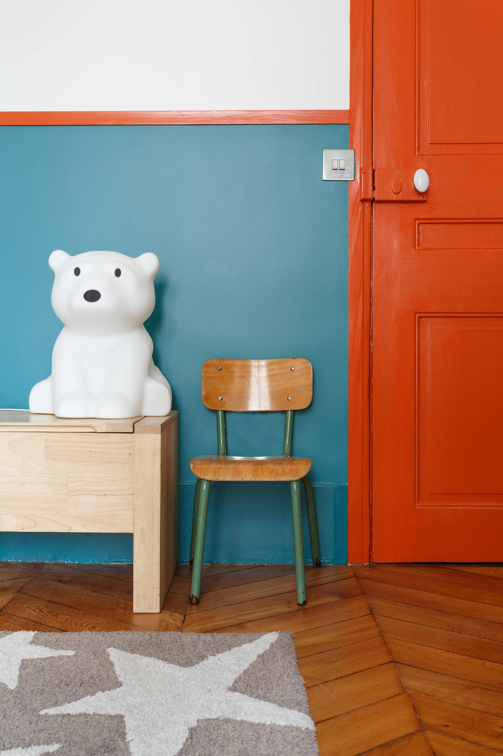 Entre rouge et orange, les tonalités vermillon complètent harmonieusement les teintes entre bleu et vert. C’est un jeu de ce type que Studio Castille a ici créé, avec un mur peint en bleu-vert dans sa moitié inférieure, séparée des hauteurs blanches par un tasseau de bois peint dans un orange soutenu, qui rejoint une porte de ce même orange. Pour cette chambre d’enfants, ce mélange de couleurs permet de créer sans excès ou mièvrerie une atmosphère ludique et colorée, derrière la chaise d’école et le meuble en bois clair. L’oeil y est sollicité et réjoui sans être submergé.