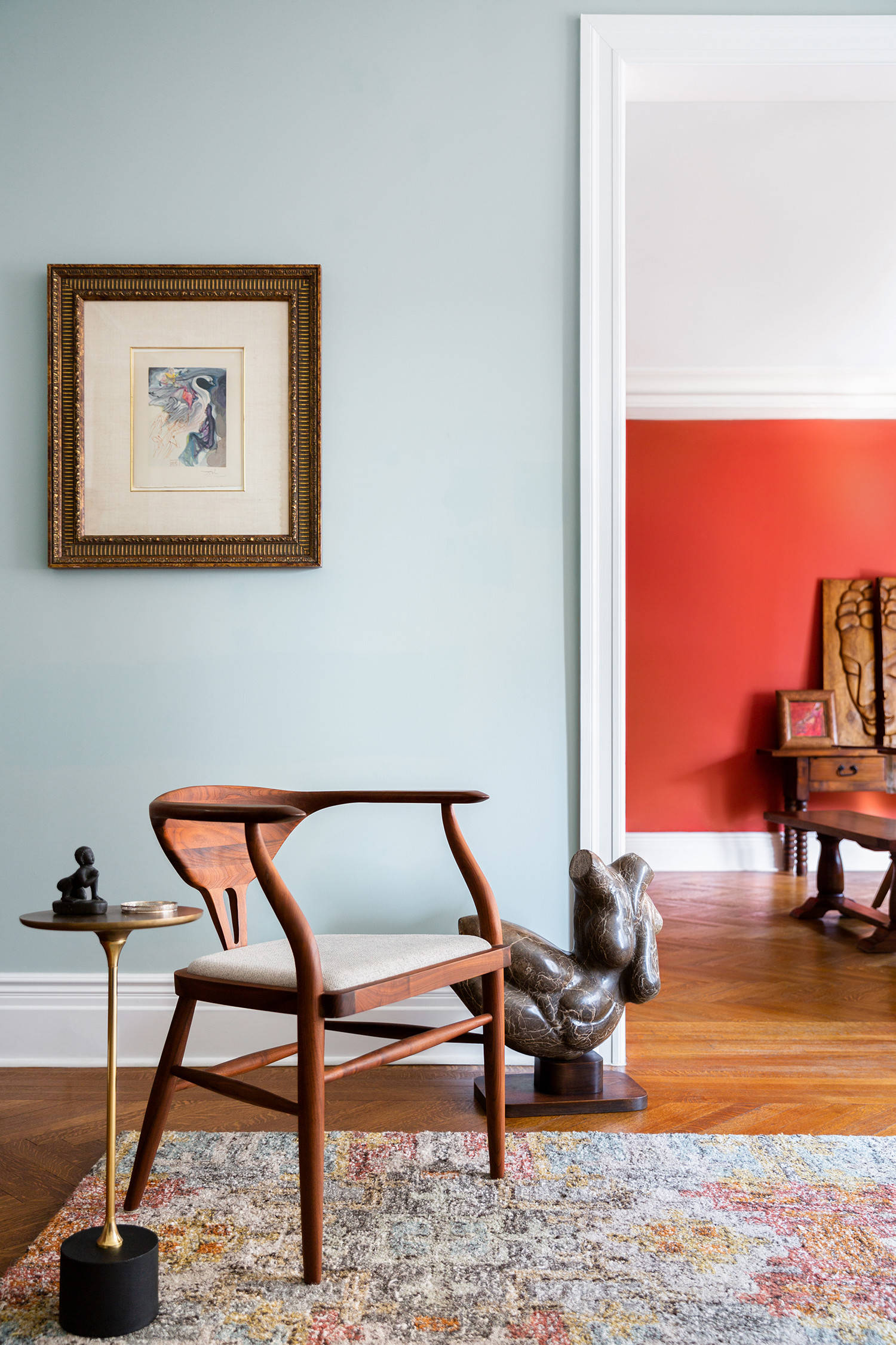 Le vermillon est idéal pour créer un mur d’accent. Ce dernier a une fonction esthétique forte : paré d’une façon qui attire l’oeil, il dynamise le regard et réorganise la perception visuelle d’un ensemble. Placé ici, par InsideWright, dans une pièce en arrière-plan d’un séjour bleu ciel au sol habillé d’un tapis mélangeant diverses notes pastel, ce mur éclatant ouvre le regard et les perspectives, agrandit l’espace en attirant l’œil vers le fond. La couleur, rajeunissante et solaire, équilibre les meubles de bois au cachet ancien et s’harmonise à leur teinte chaude et foncée, créant un décor idéal pour valoriser le panneau artistique en bas-relief orné d’un visage stylisé.