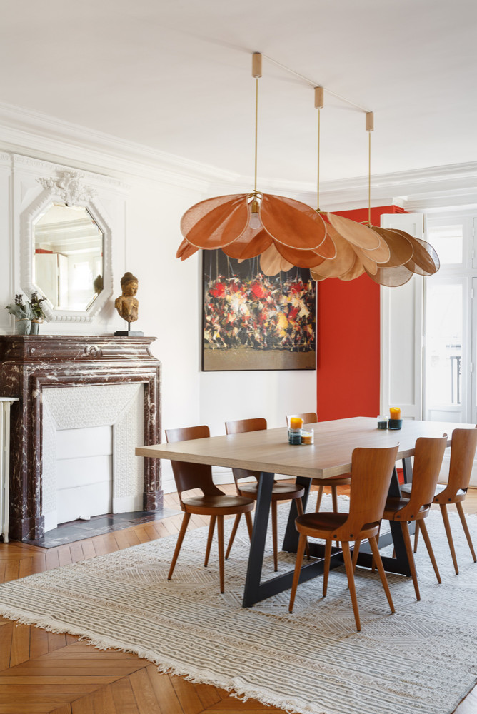 Cette photo est issue de la même rénovation par Mon Concept Habitation que la précédente, dans un appartement parisien qui mélange à la fois des éléments anciens – le parquet point de Hongrie, la cheminée de marbre, le miroir – et modernes – chaises designées, table épurée à la scandinave. Le tout avec une touche de poésie, de confort et de chaleur : un tapis réchauffe le sol de bois, des abat-jour aux formes florales s’ouvrent au-dessus de la table, un vaste tableau se déploie. Le vermillon apparaît en mur d’accent, colorant de haut en bas une zone qui jouxte l’œuvre picturale et la fenêtre. Ce rectangle éclatant attire ainsi l’attention sur le jour et la lumière. Le large tableau mural perpendiculaire à ce mur d’accent habille le décor avec majesté, tout en offrant une synthèse artistique du jeu de teintes de la pièce, entre noir et blanc, blond doré et rouge éclatant.