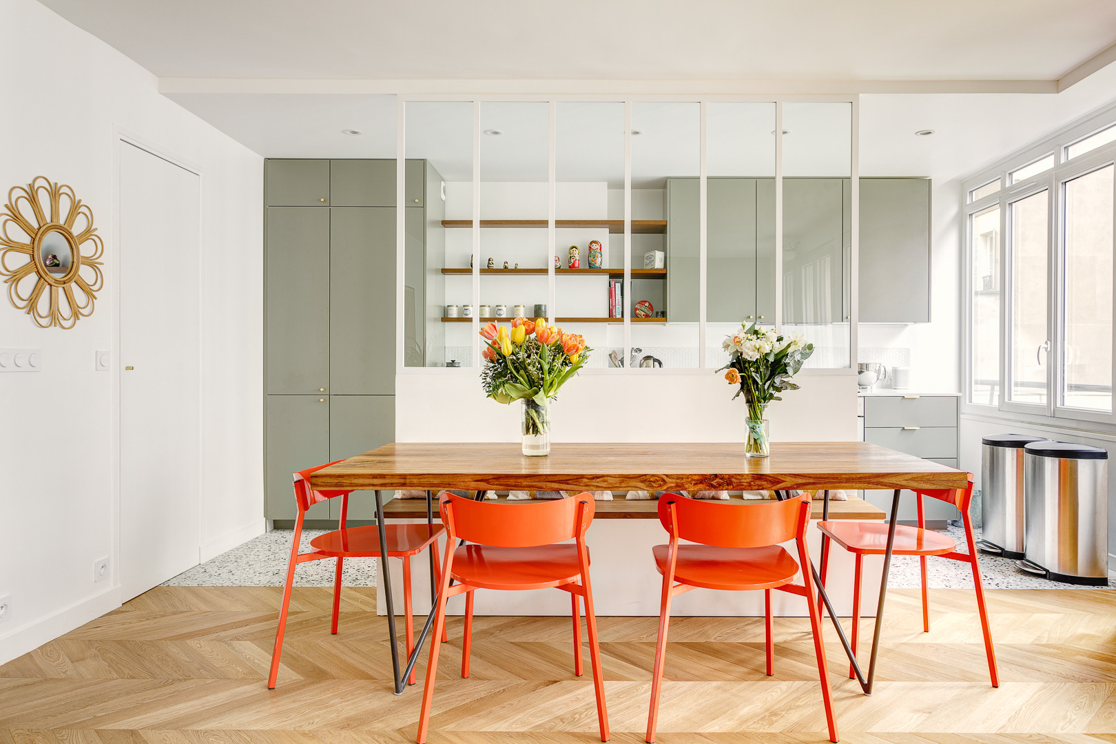 Du vermillon habille ici quatre chaises autour d’une table en bois simple, seules notes vives dans un séjour ouvert très lumineux et simple aux murs blancs, au sol parqueté, conçu par Mon Concept habitation. La couleur souligne immédiatement les sièges et en fait l’élément le plus vibrant aux regards, accentuant la détente et la convivialité qu’ils incarnent. Elle entretient également une harmonie complémentaire avec la cuisine ouverte que l’on voit en fond et ses rangements revêtus de vert sauge. Très solaire, elle fait pétiller cette pièce plutôt douce et sage.