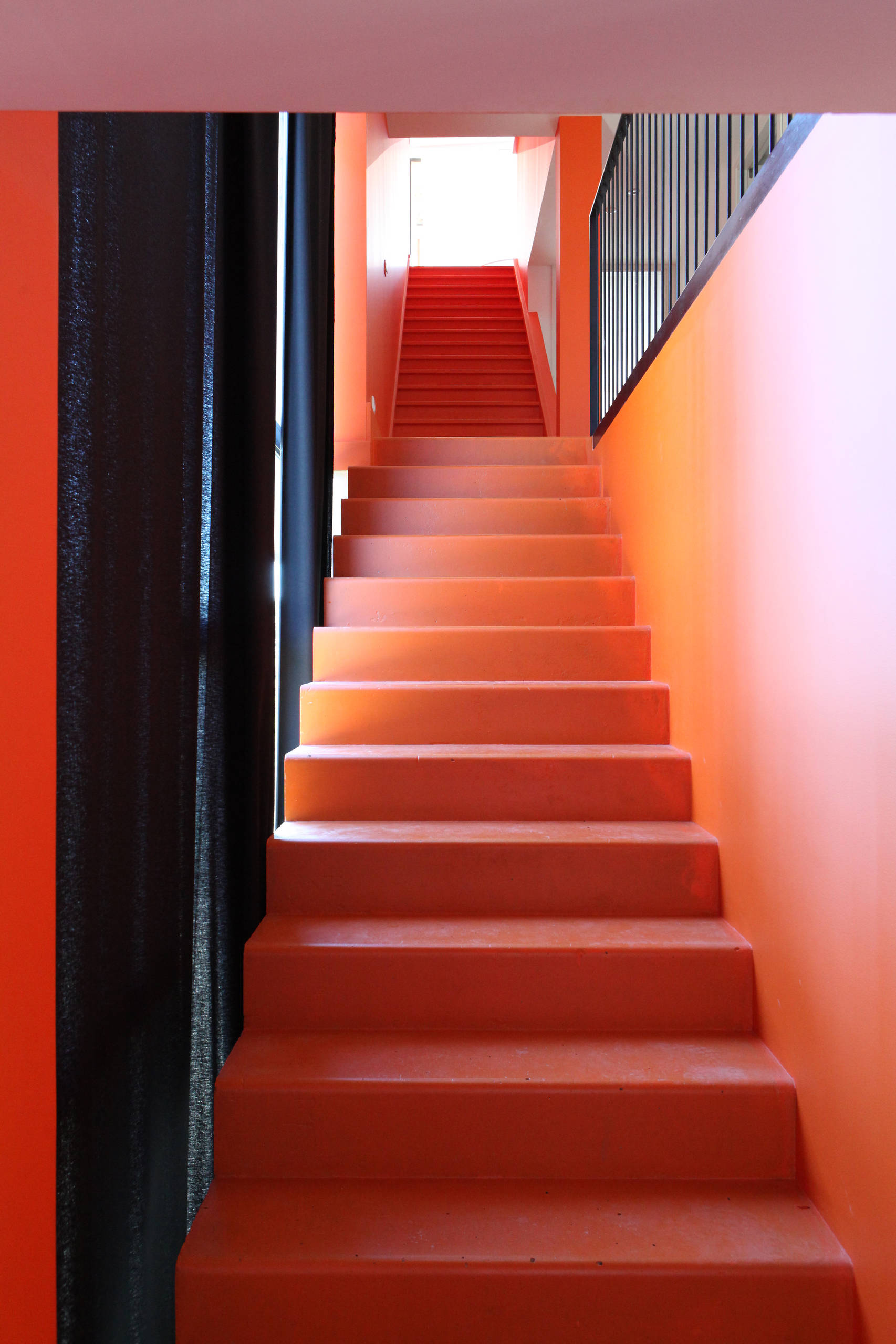 Cet escalier coincé entre deux murs et un rideau est un simple lieu de passage, sans étagères, rampe ou ornement. Seule la couleur, décidée ici par by:architectes, permet de l’habiller et de le personnaliser. Mal la choisir serait risqué : le blanc pourrait être austère, alors qu’un noir ou un bleu marine créeraient vite un effet tunnel sombre et déprimant. Franc et fruité, le vermillon agrémente l’espace, évite la sensation d’être prisonnier d’un corridor de marches, égaye et illumine.