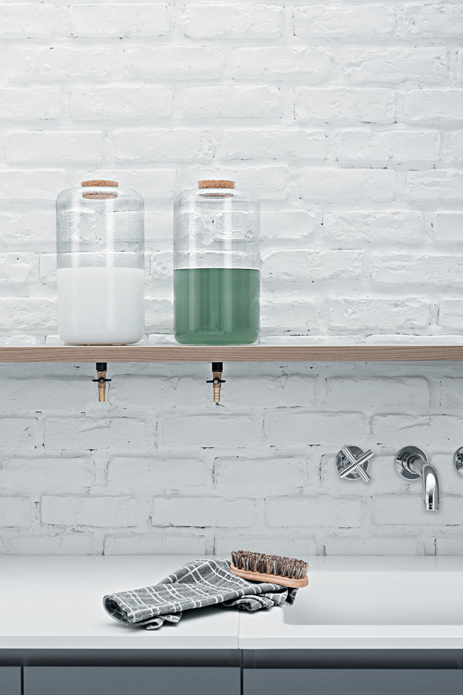 Empty your detergent into attractive glass bottles for ease of use and for aesthetics. You will enjoy spending time in your laundry if the room is designed with thought and attention to detail.