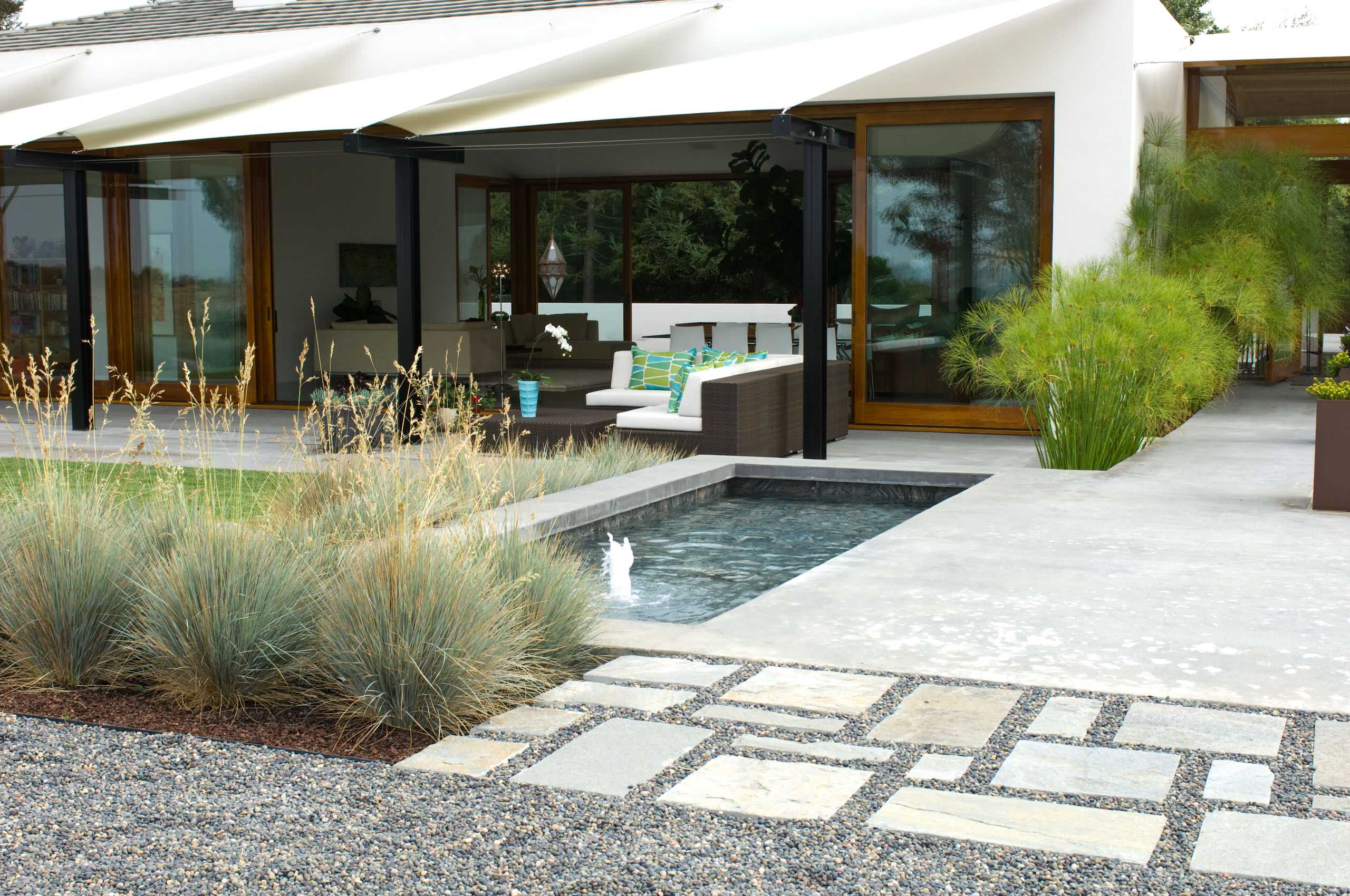 There are no symmetrical elements of this contemporary patio, yet the components feel balanced thanks to the rectilinear design "blocks" aligned both perpendicularly and horizontally with the home's facade. The stepping-stone "carpet" and the section of oat grasses balance nicely with the solid concrete patio and the pool. These elements and textures are all the more exciting because of the asymmetrical arrangement.